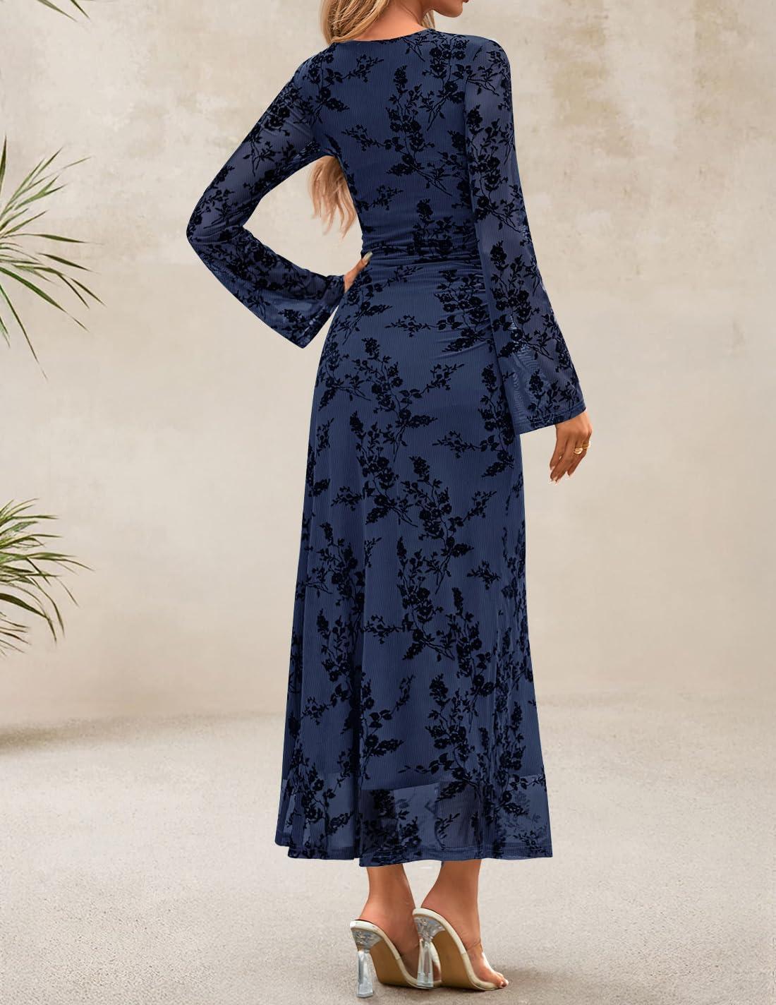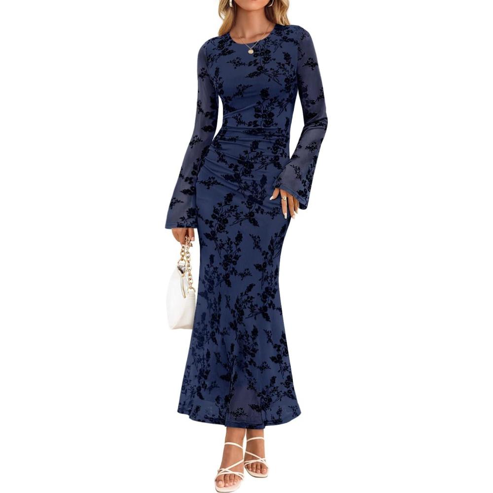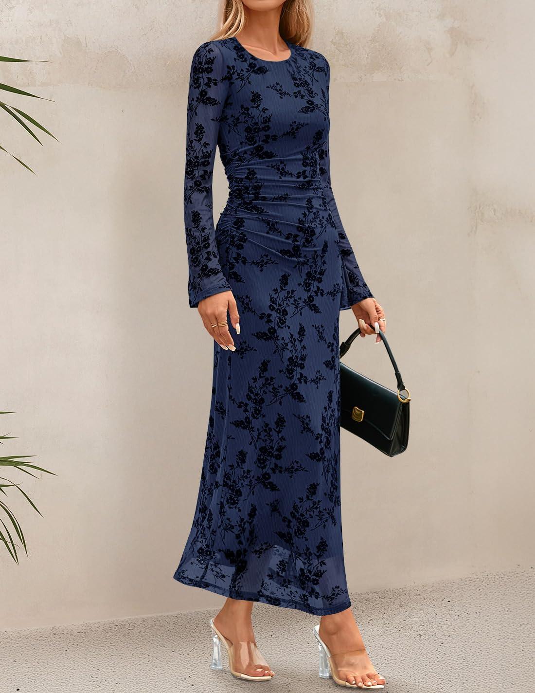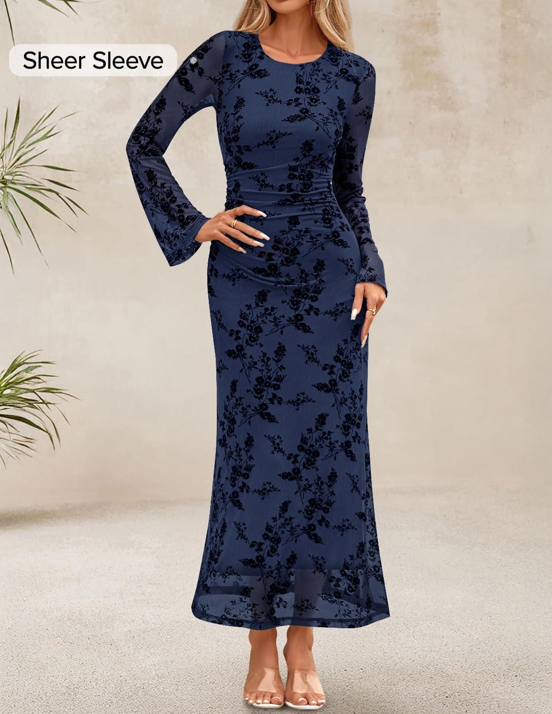 ZESICA Women’s Long Sleeve Floral Bodycon Dress 2025 Fall Fashion Ruched Mesh Wedding Guest Cocktail Party Maxi Dresses(Navy)