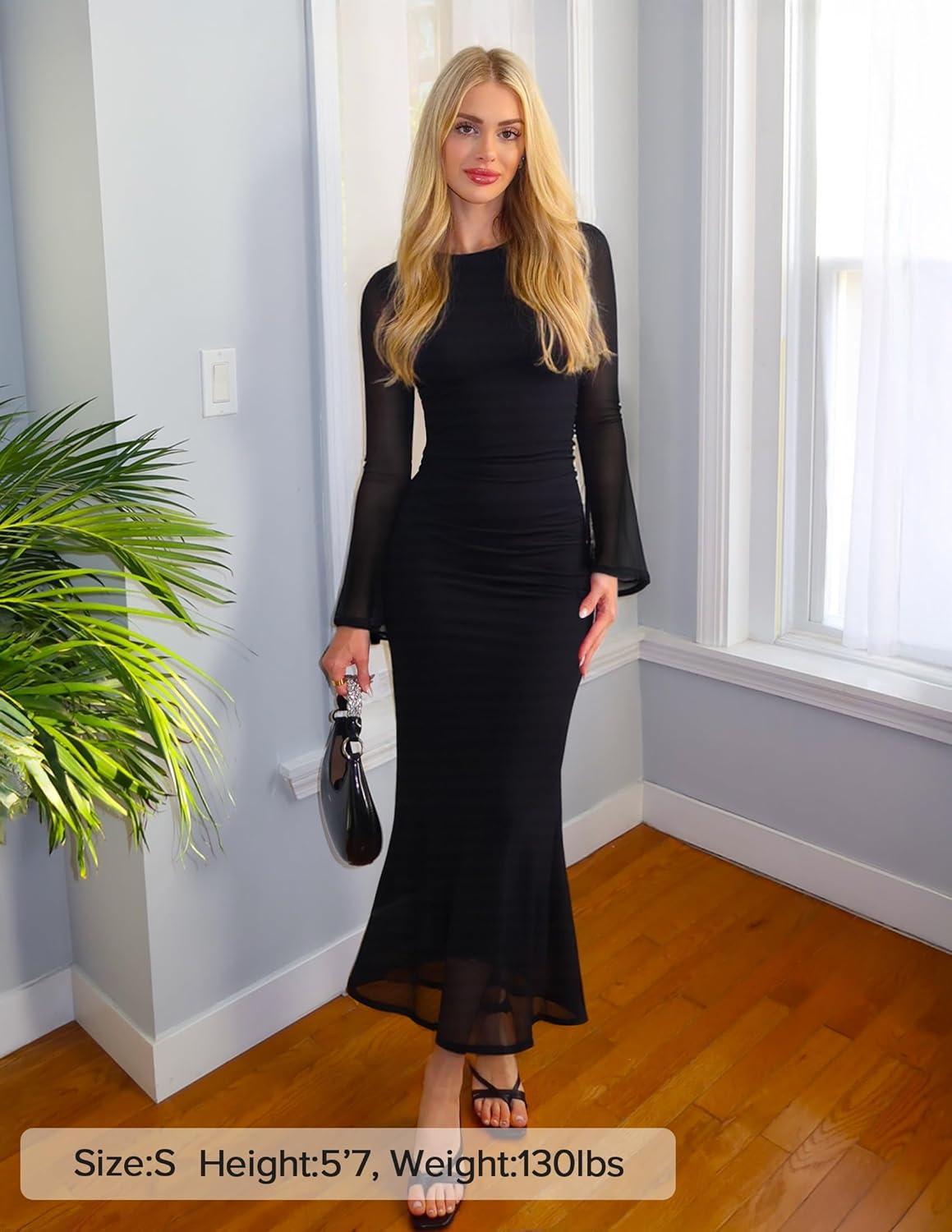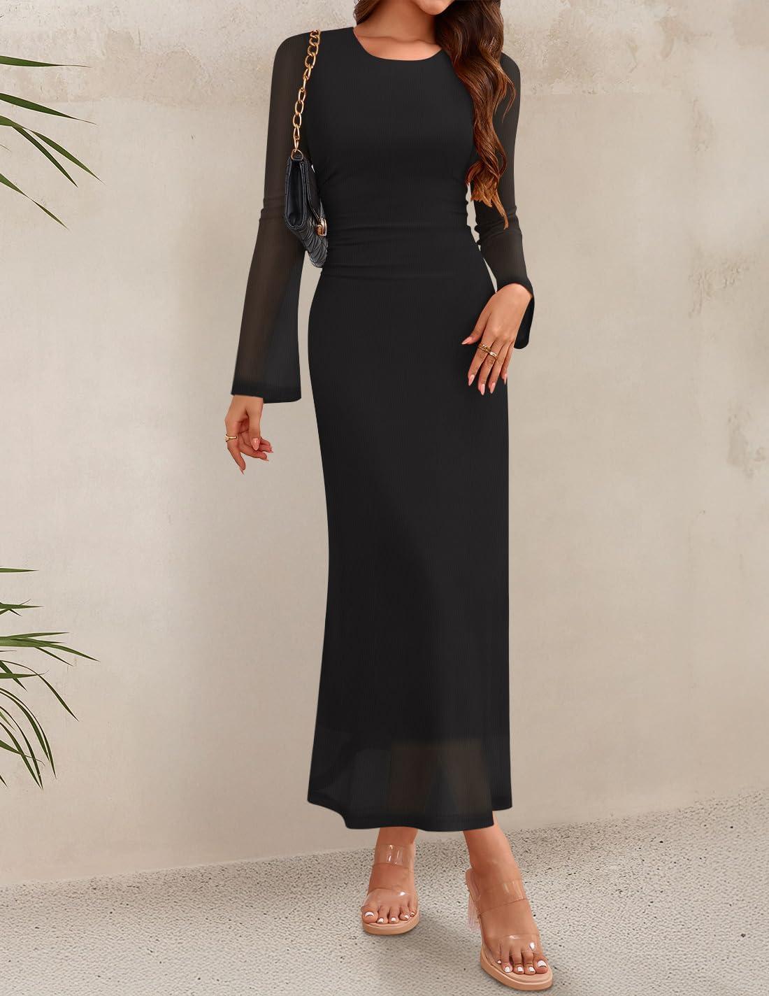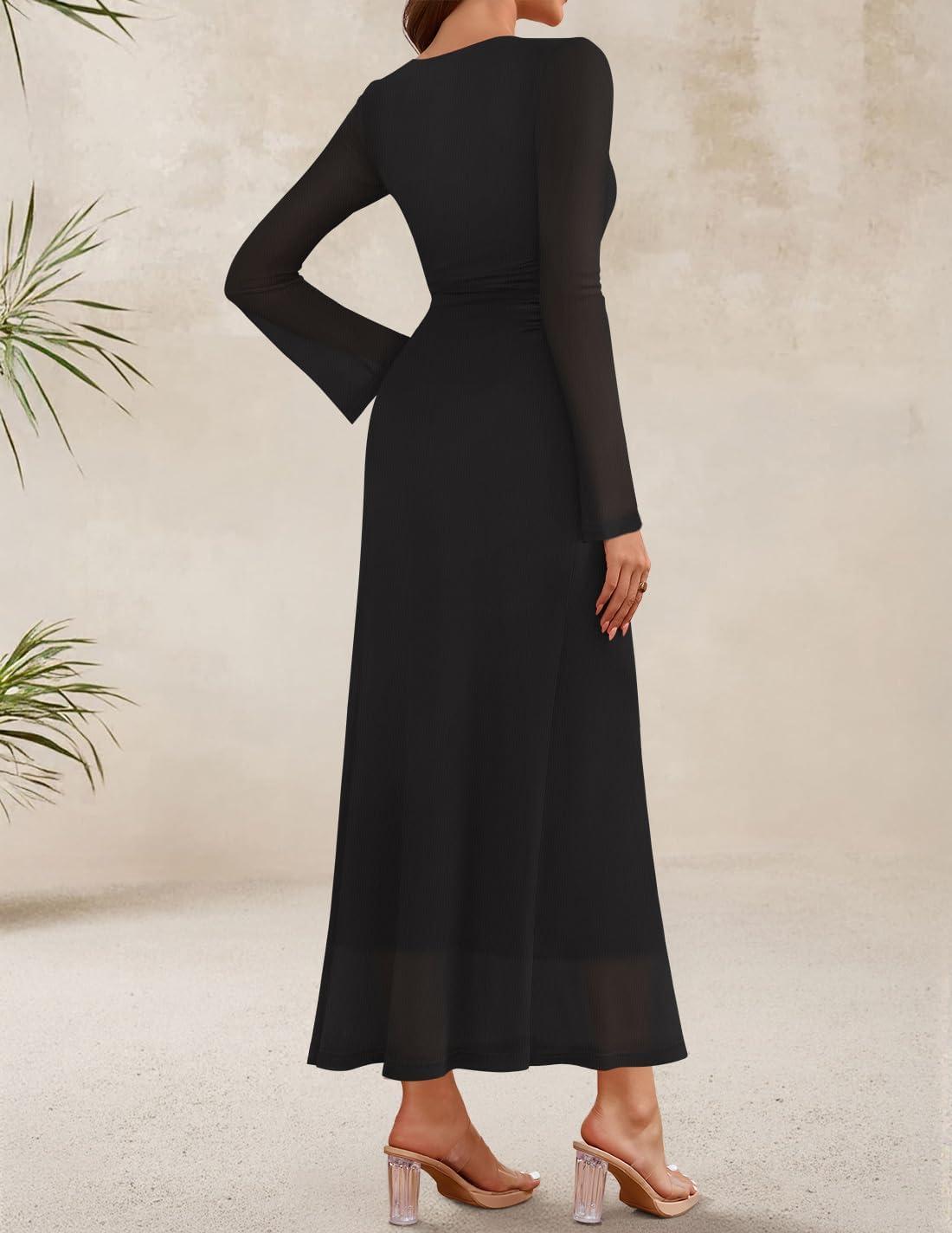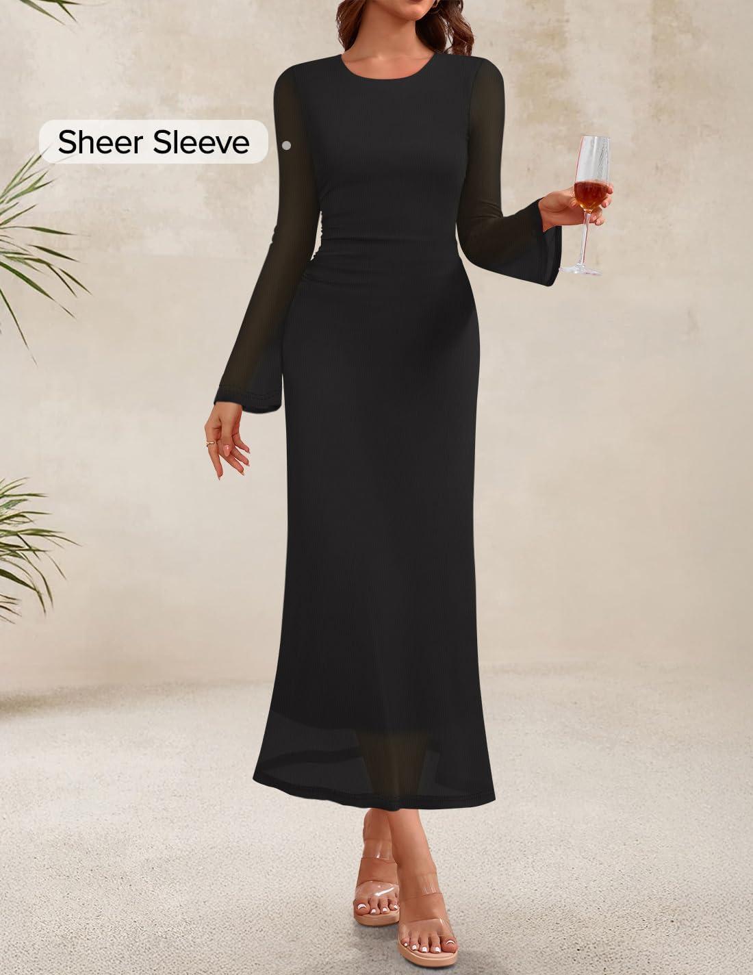 ZESICA Women’s Long Sleeve Floral Bodycon Dress 2025 Fall Fashion Ruched Mesh Wedding Guest Cocktail Party Maxi Dresses(Solid Black)