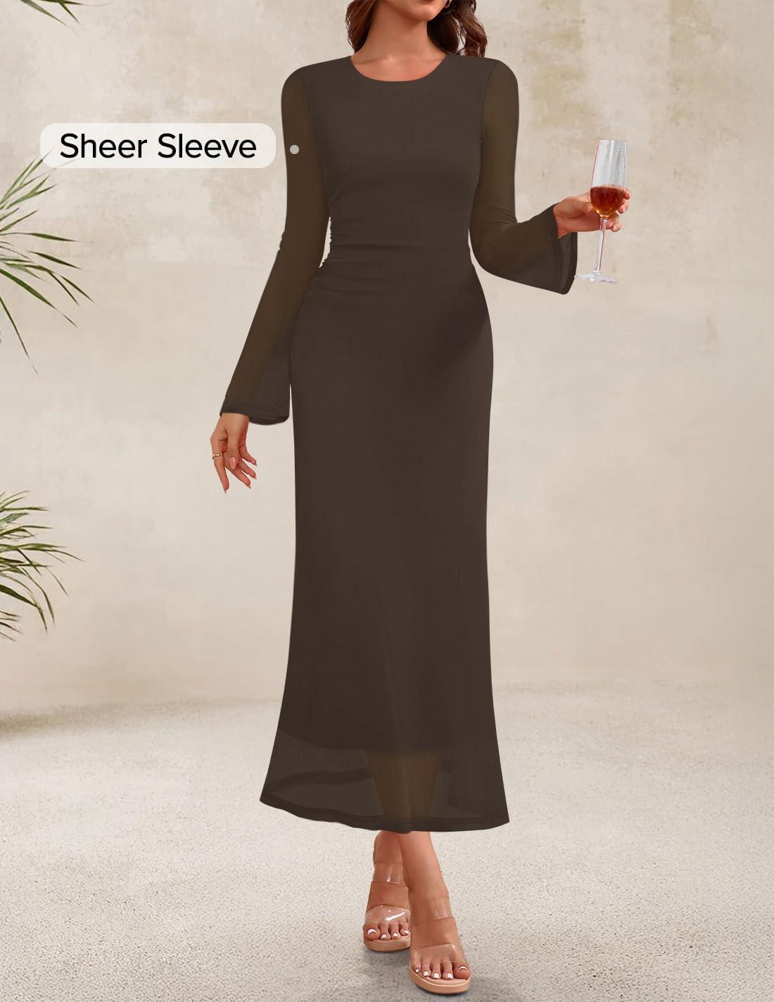 ZESICA Women's Long Sleeve Floral Bodycon Dress 2025 Fall Fashion Ruched Mesh Wedding Guest Cocktail Party Maxi Dresses(Solid Coffee)