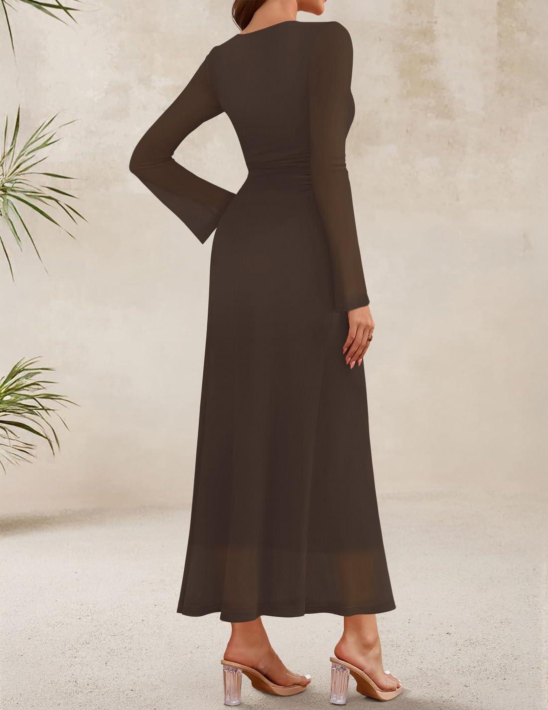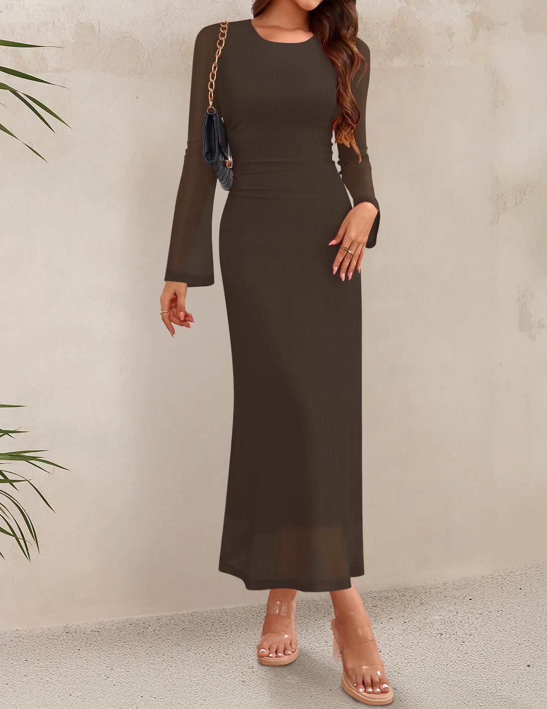 ZESICA Women’s Long Sleeve Floral Bodycon Dress 2025 Fall Fashion Ruched Mesh Wedding Guest Cocktail Party Maxi Dresses(Solid Coffee)