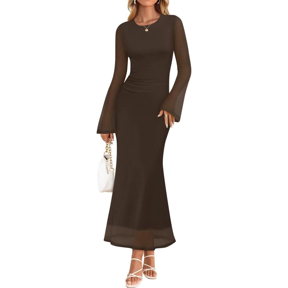 imageZESICA Womens Long Sleeve Floral Bodycon Dress 2025 Fall Fashion Ruched Mesh Wedding Guest Cocktail Party Maxi DressesSolid Coffee