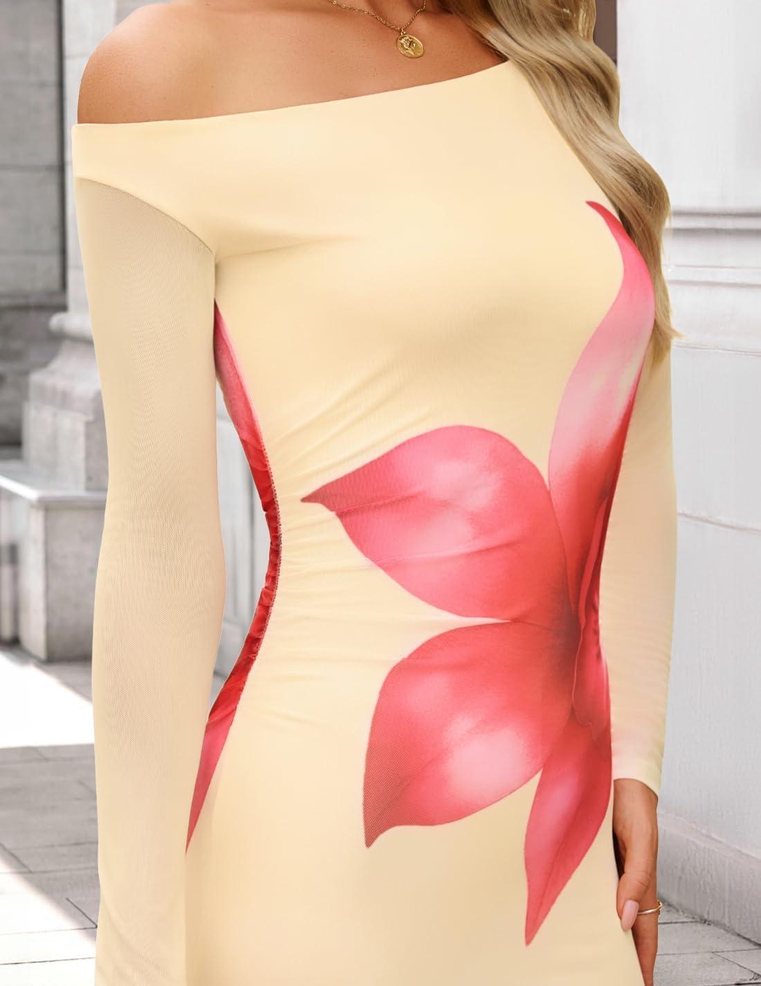 ZESICA Women's Long Sleeve Floral Maxi Dress 2025 Fall Off Shoulder Bodycon Ruched Mesh Cocktail Wedding Guest Dresses(Apricot)
