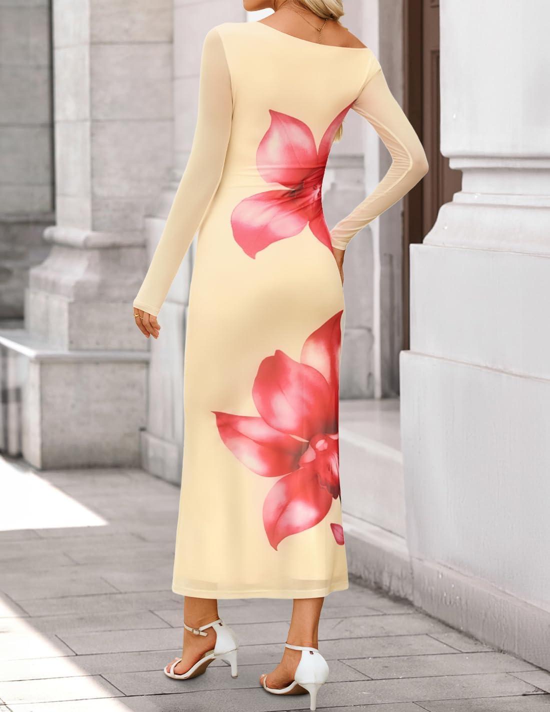 ZESICA Women’s Long Sleeve Floral Maxi Dress 2025 Fall Off Shoulder Bodycon Ruched Mesh Cocktail Wedding Guest Dresses(Apricot)