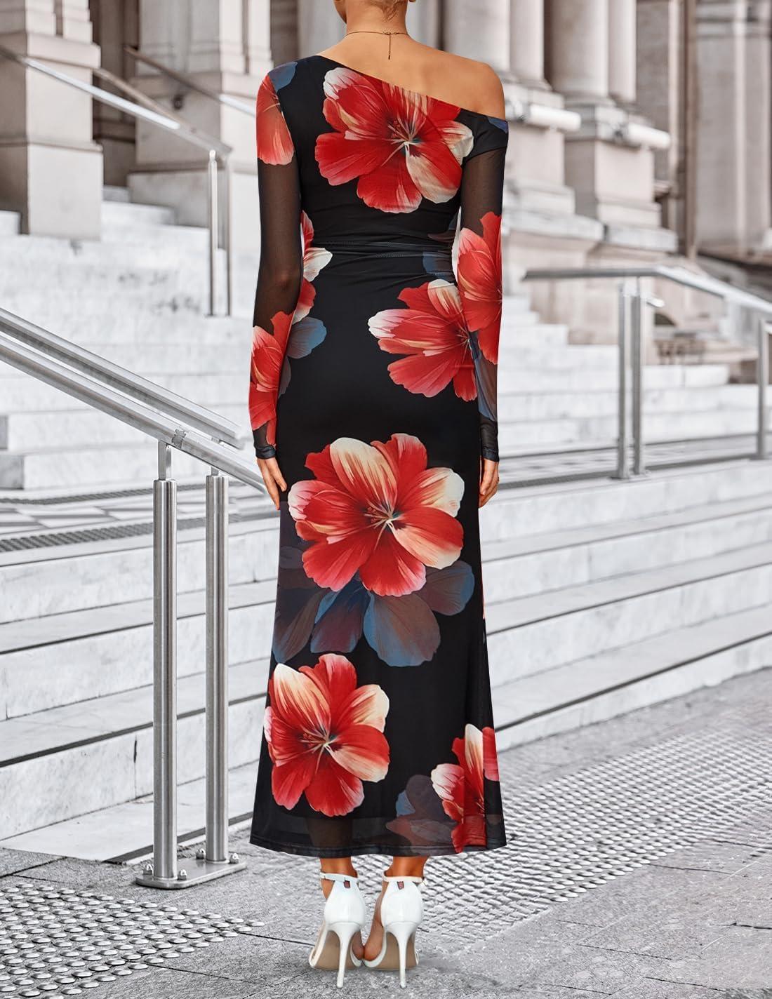 ZESICA Women’s Long Sleeve Floral Maxi Dress 2025 Fall Off Shoulder Bodycon Ruched Mesh Cocktail Wedding Guest Dresses(Black)
