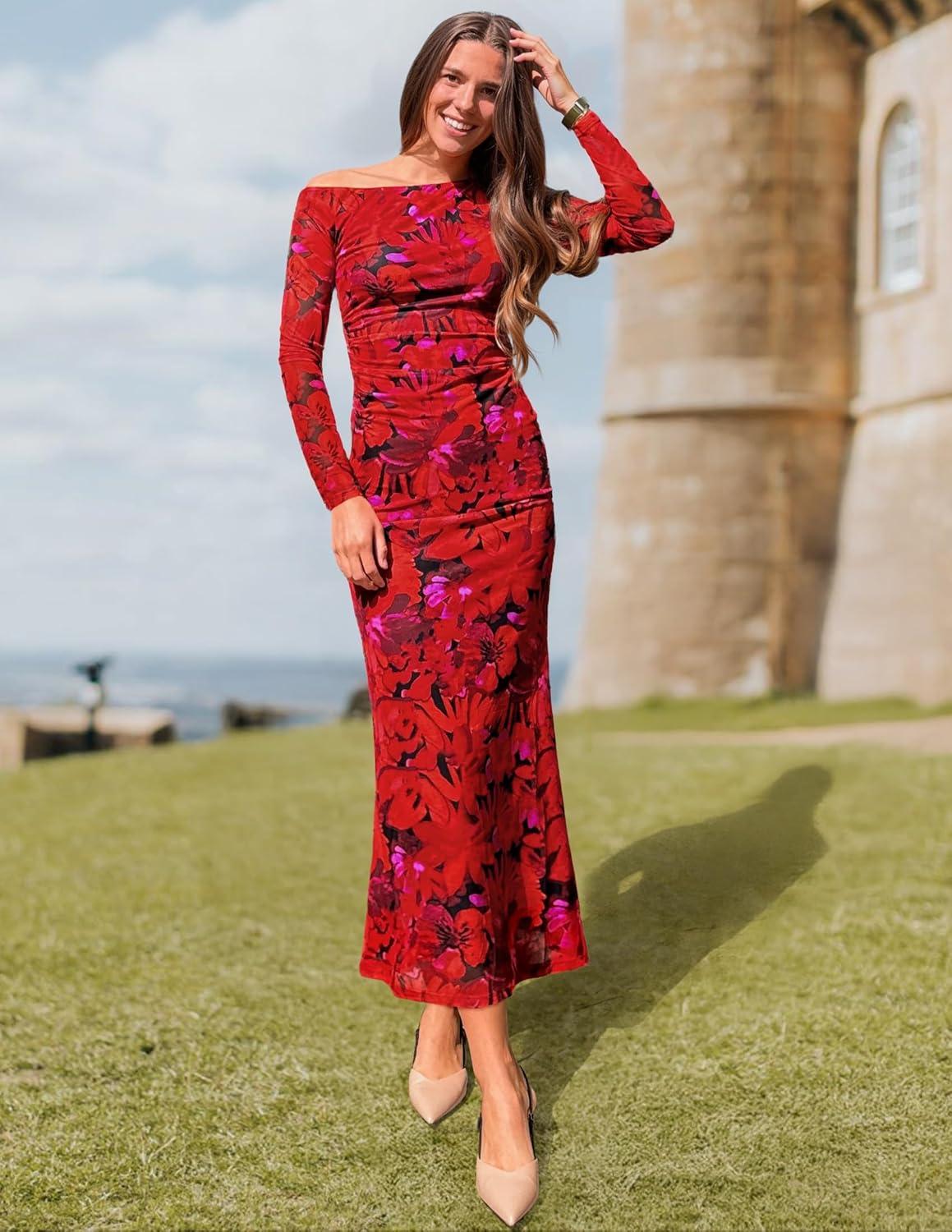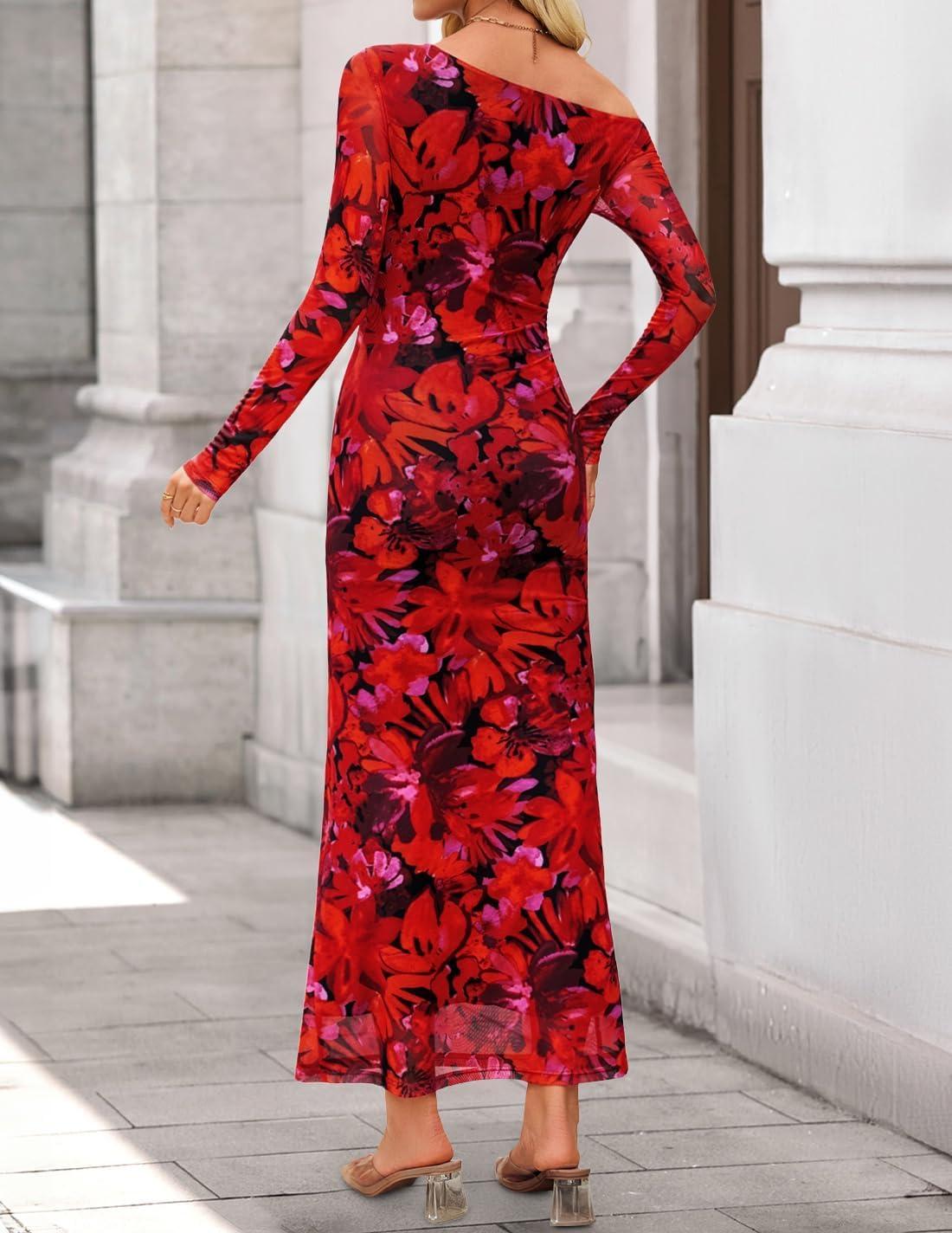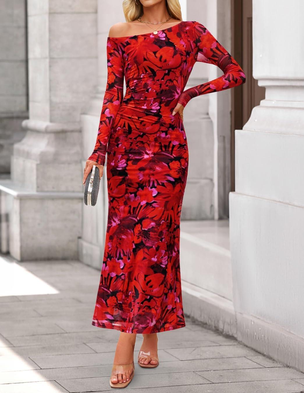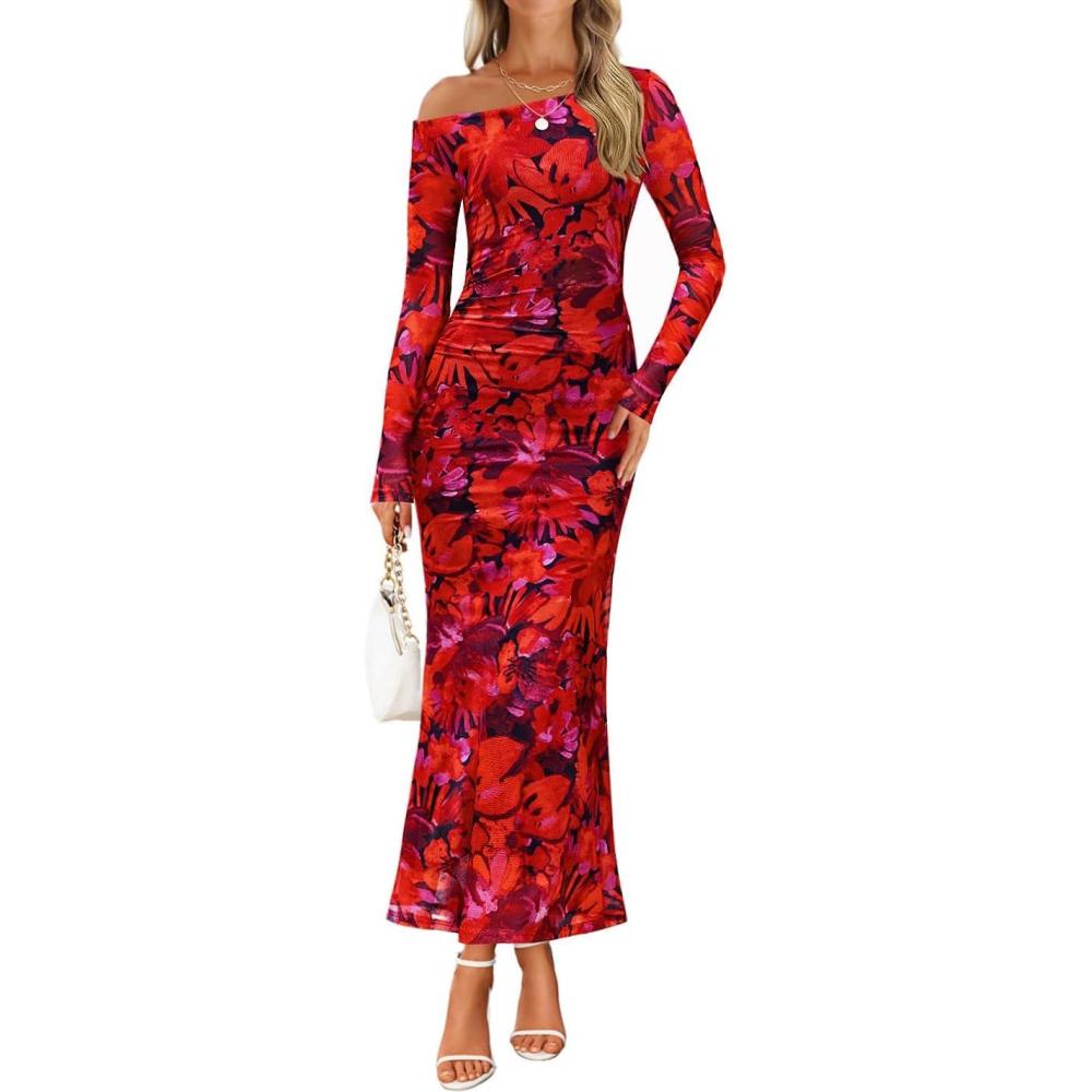 ZESICA Women’s Long Sleeve Floral Maxi Dress 2026 Fall Off Shoulder Bodycon Ruched Mesh Cocktail Wedding Guest Dresses(Red)