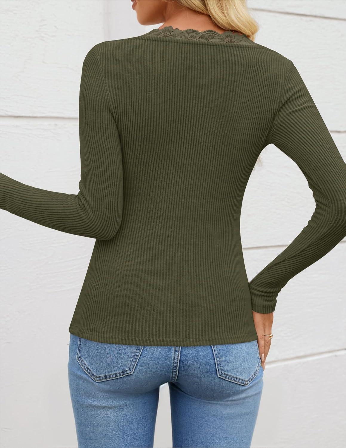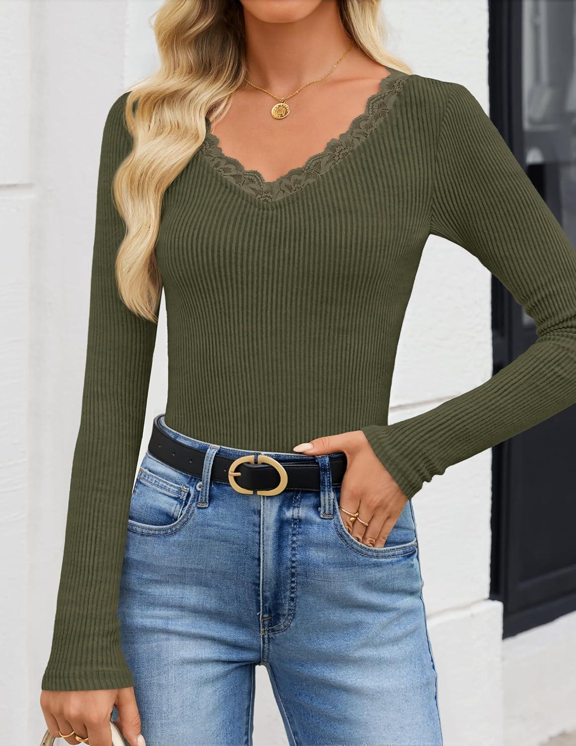 ZESICA Women's Long Sleeve Lace V Neck Fall Shirts Slim Fit Going Out Tops Ribbed Knit Dressy Business Casual Blouses(Army Green)