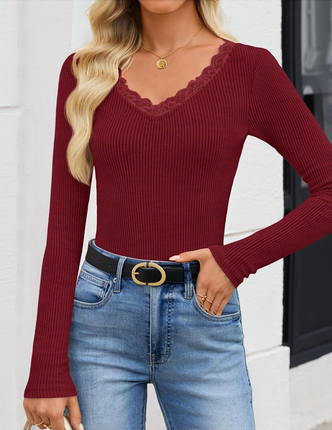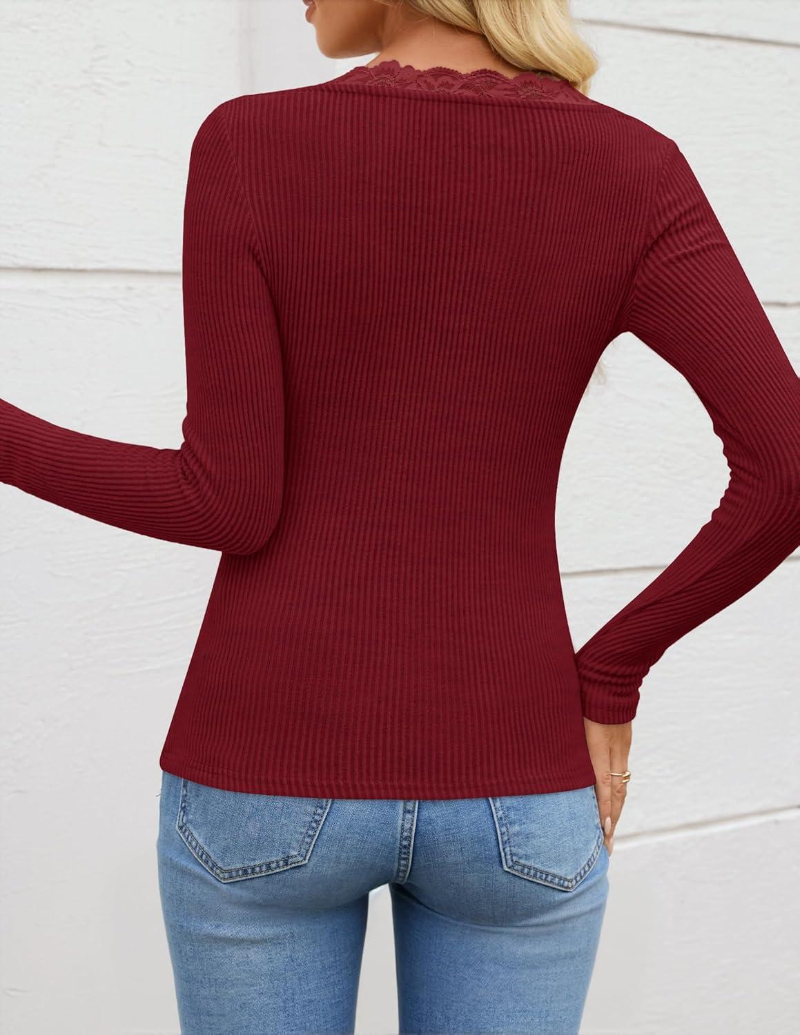 ZESICA Women's Long Sleeve Lace V Neck Fall Shirts Slim Fit Going Out Tops Ribbed Knit Dressy Business Casual Blouses(Wine Red)