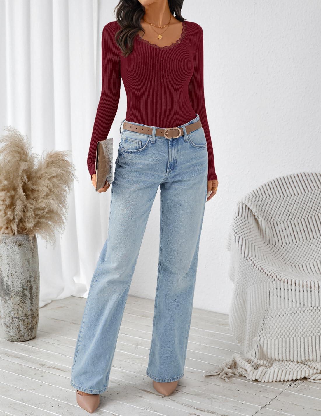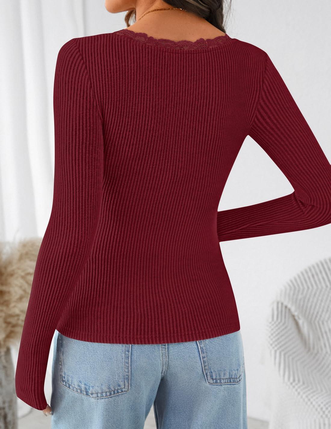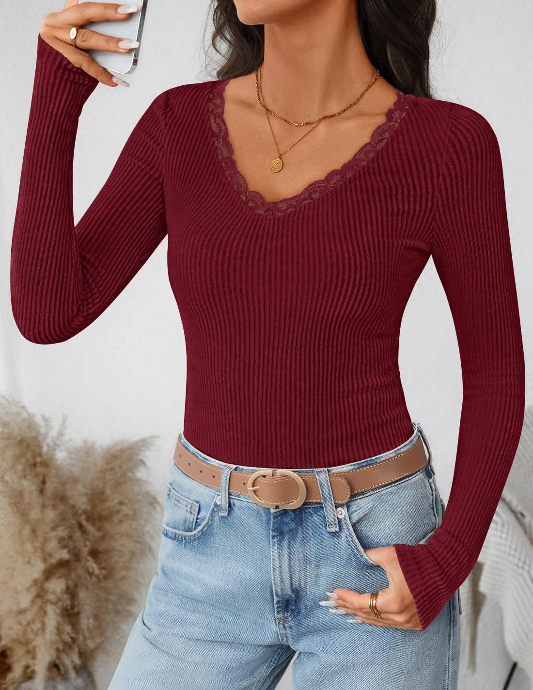 imageZESICA Womens Long Sleeve Lace V Neck Shirts 2025 Fall Fashion Slim Fit Tops Ribbed Knit Dressy Business Casual BlousesWine Red