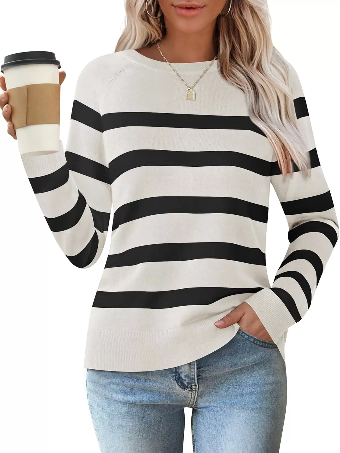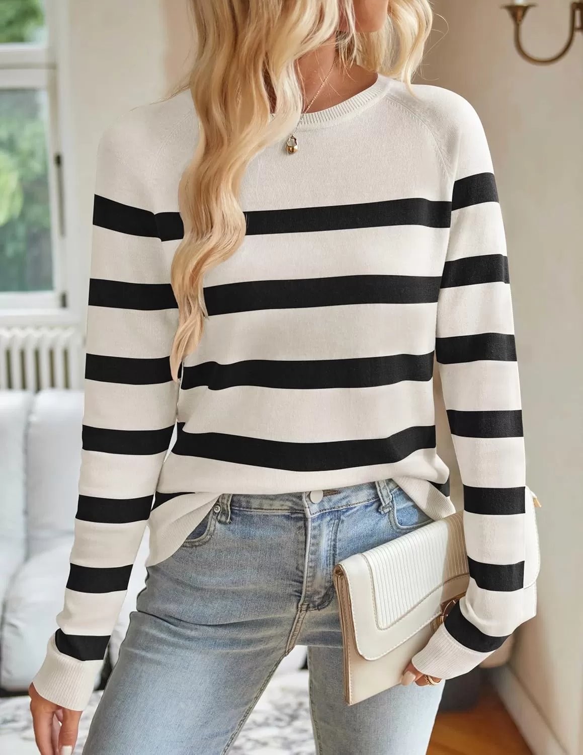 ZESICA Women’s Long Sleeve Lightweight Striped Tops 2024 Fall Crewneck Ribbed Knit Shirts(White)
