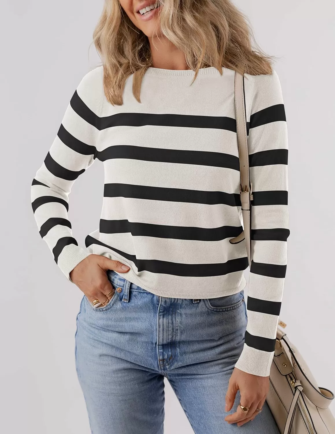 ZESICA Women’s Long Sleeve Lightweight Striped Tops 2024 Fall Crewneck Ribbed Knit Shirts(Lightgrey)