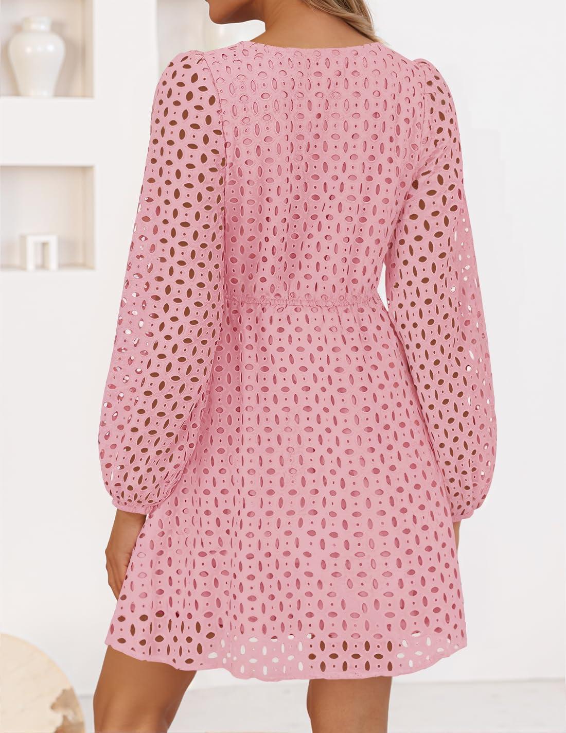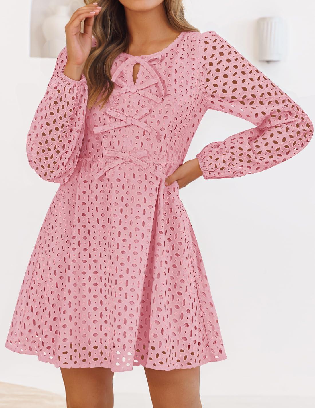 ZESICA Women’s Long Sleeve Mini Dress 2025 Fall Crewneck Tie Front Hollow Out Eyelet Babydoll A Line Short Dresses(Pink)
