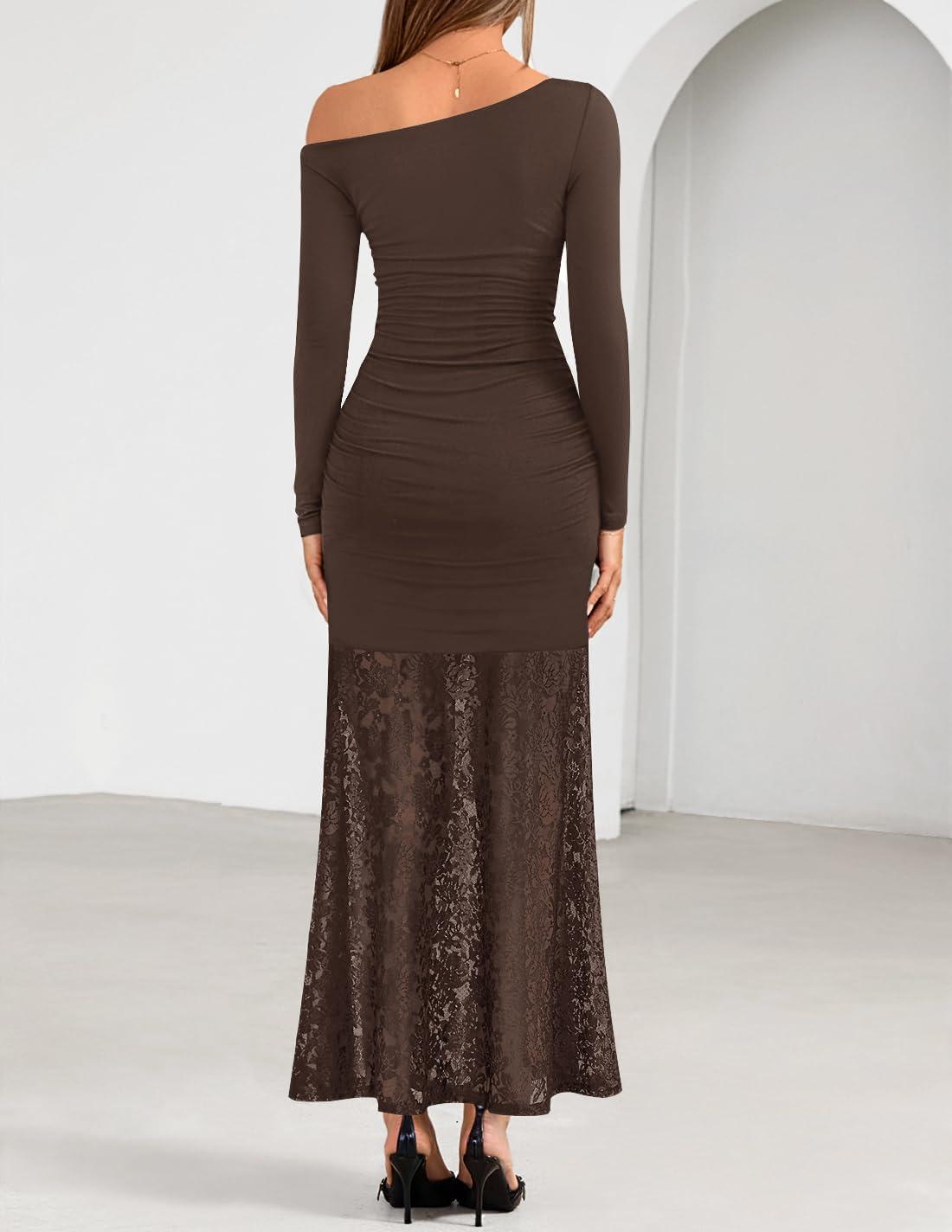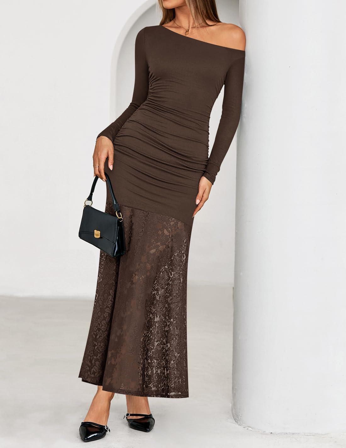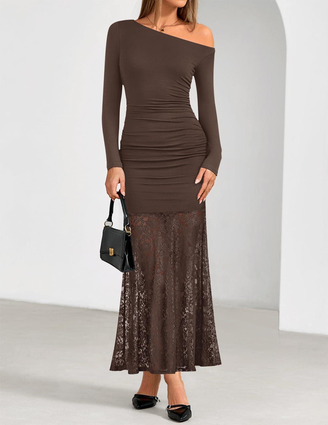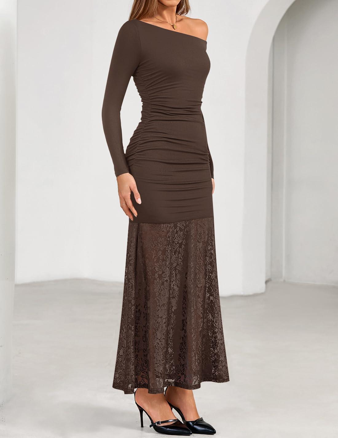 ZESICA Women’s Long Sleeve Off Shoulder Bodycon Dresses Fall 2025 Ruched Lace Wedding Guest Cocktail Formal Maxi Dress(Coffee)