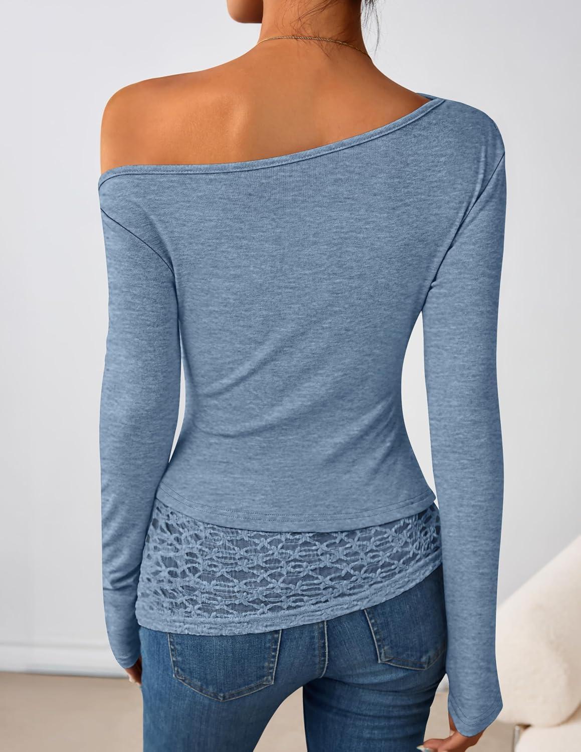ZESICA Women’s Long Sleeve Off Shoulder Tops Fall 2025 Casual Boat Neck Lace Slim Fit Going Out Y2k Shirts Blouses(Blue)