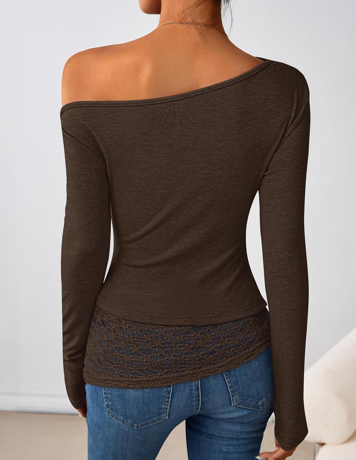 ZESICA Women's Long Sleeve Off Shoulder Tops Fall 2025 Casual Boat Neck Lace Slim Fit Going Out Y2k Shirts Blouses(Coffee)