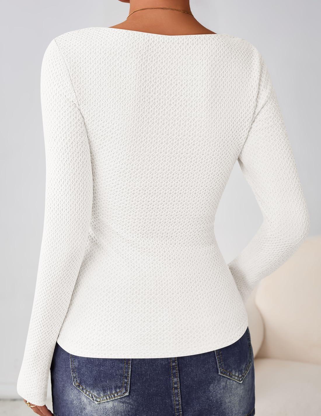 ZESICA Women's Long Sleeve Shirts 2025 Fall Fashion Square Neck Slim Fit Basic Going Out Tops Trendy Outfits(White)
