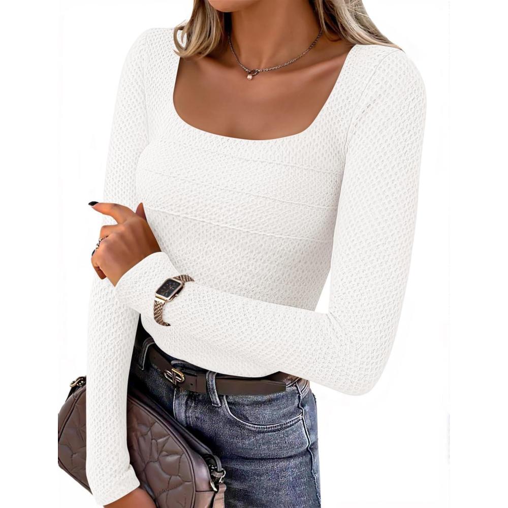 Get the ZESICA Women’s Long Sleeve Shirts 2025 Fall Fashion Square Neck Slim Fit Basic Going Out Tops Trendy Outfits(White) you want at a discounted price during our markdown sale event.