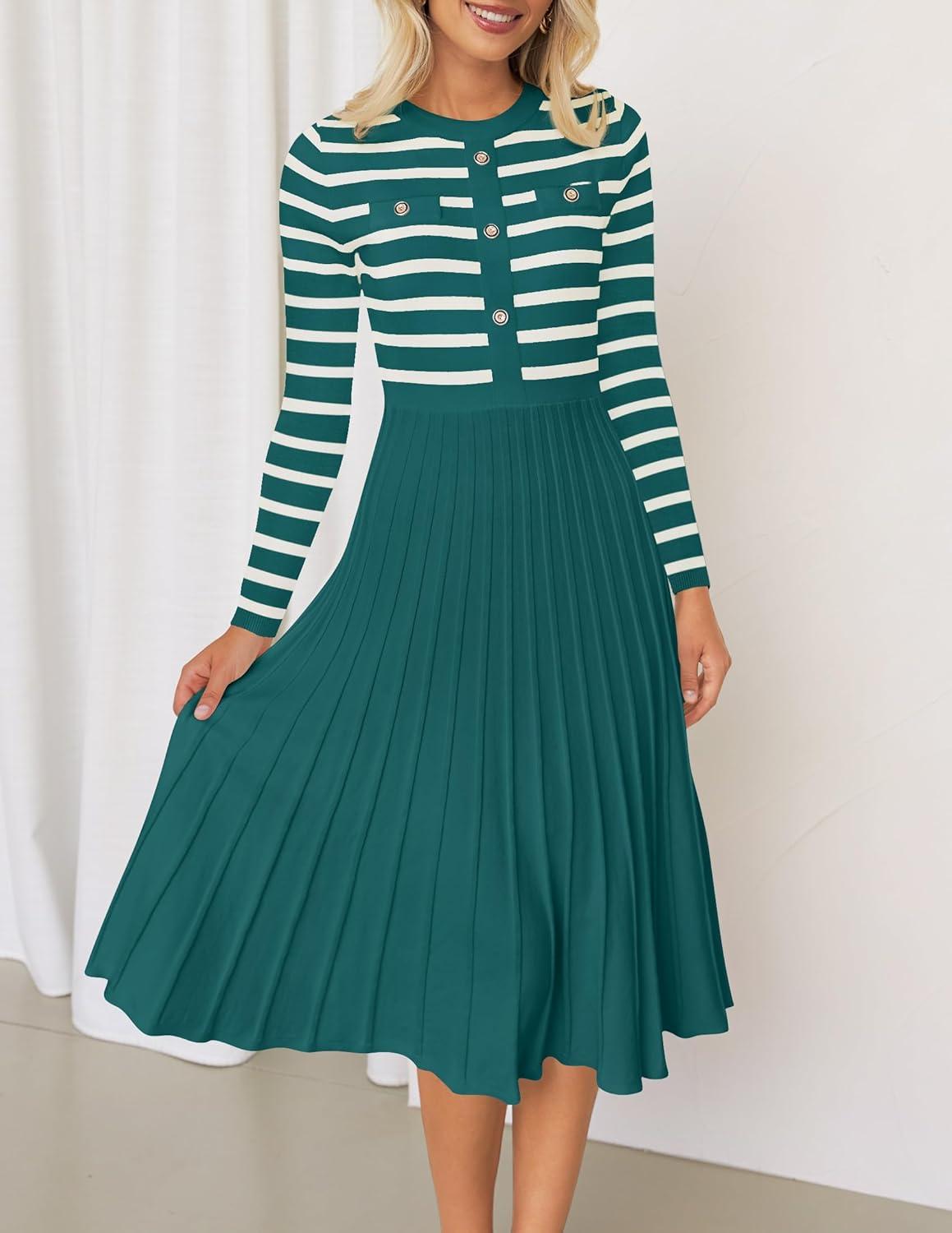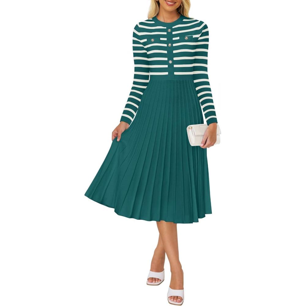 Get the ZESICA Womens Long Sleeve Striped Midi Dresses Crewneck Button Ribbed Knit Pleated A Line Swing Sweater Dress(Dark Green) you want at a discounted price during our markdown sale event.