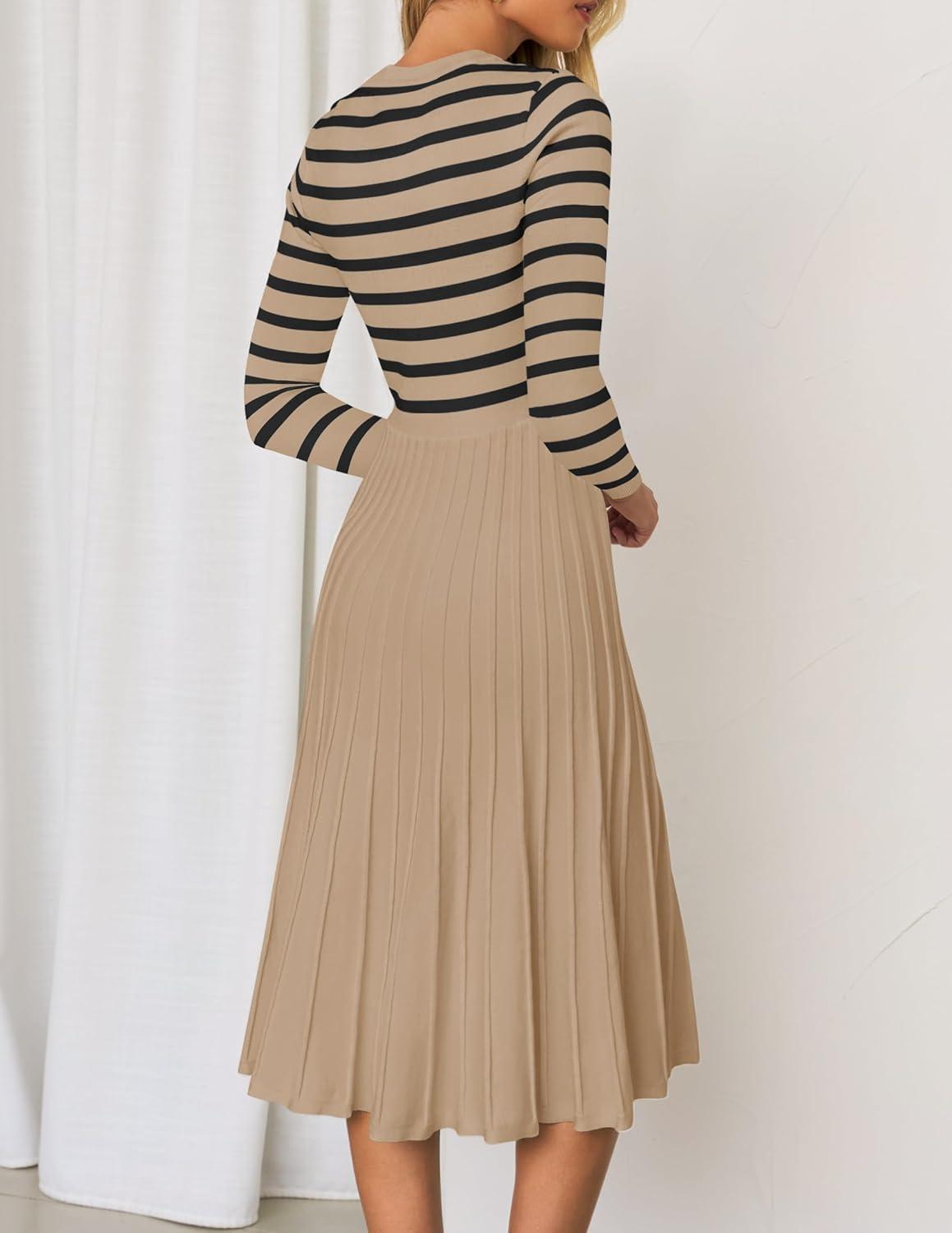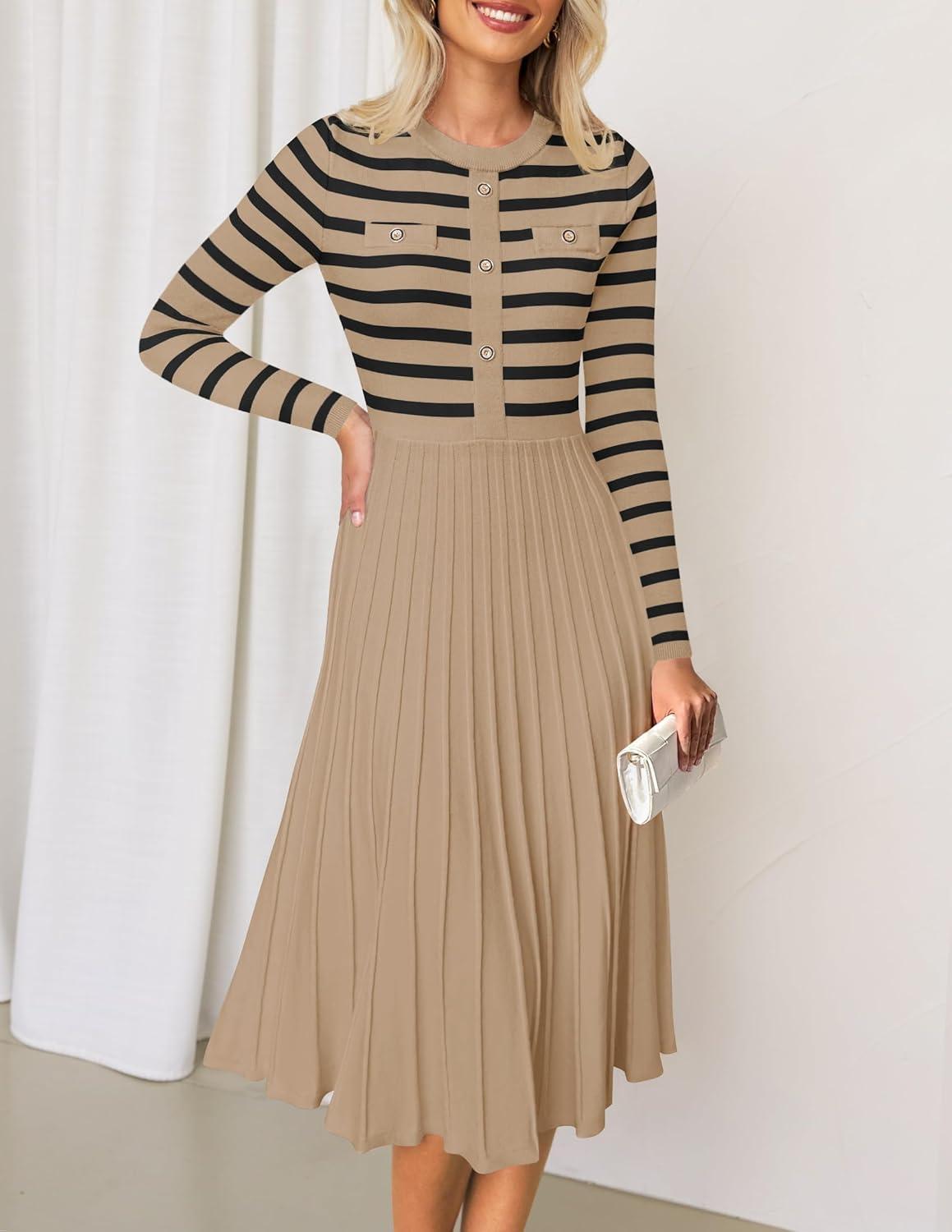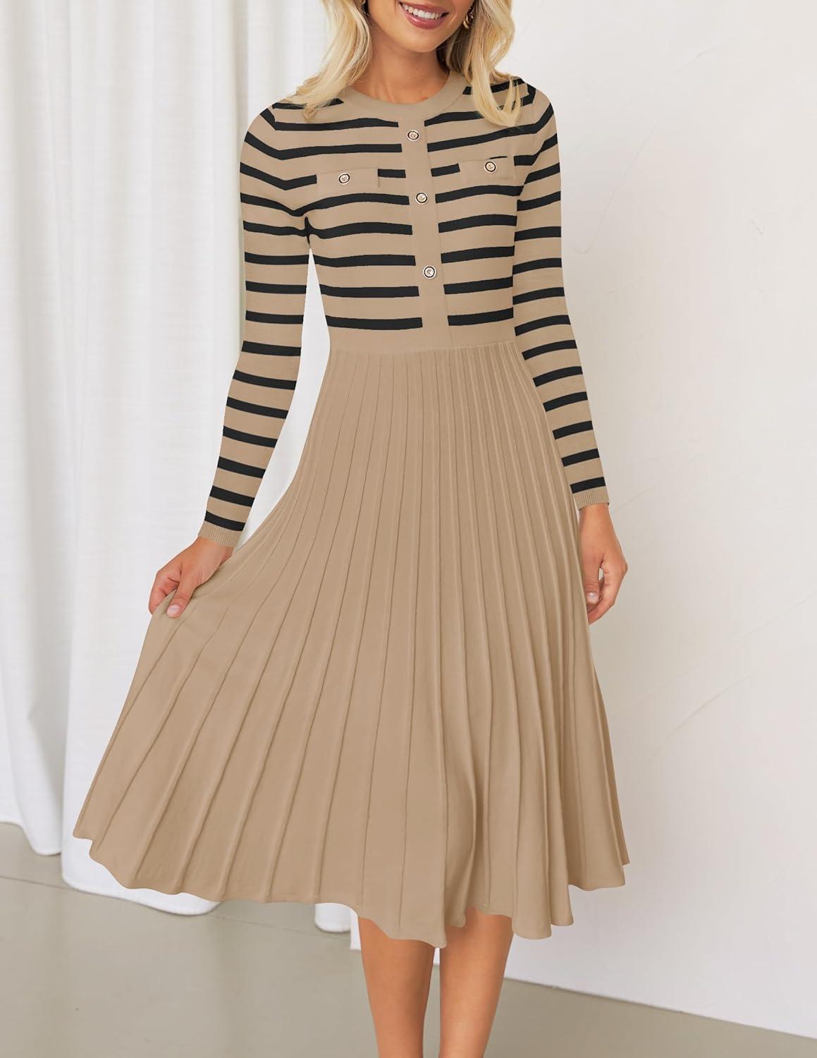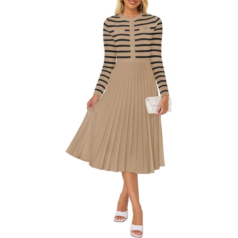 Don’t miss out on our limited-time offer: buy ZESICA Womens Long Sleeve Striped Midi Dresses Crewneck Button Ribbed Knit Pleated A Line Swing Sweater Dress(Khaki), get {accessory} 50% off!