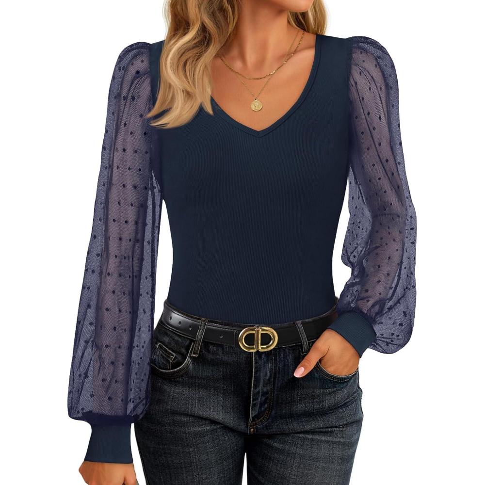 ZESICA Women's Mesh Puff Long Sleeve Shirts 2025 Fall Trendy Sexy V Neck Ribbed Knit Going Out Tops Dressy Casual Work Blouse(Navy Blue)
