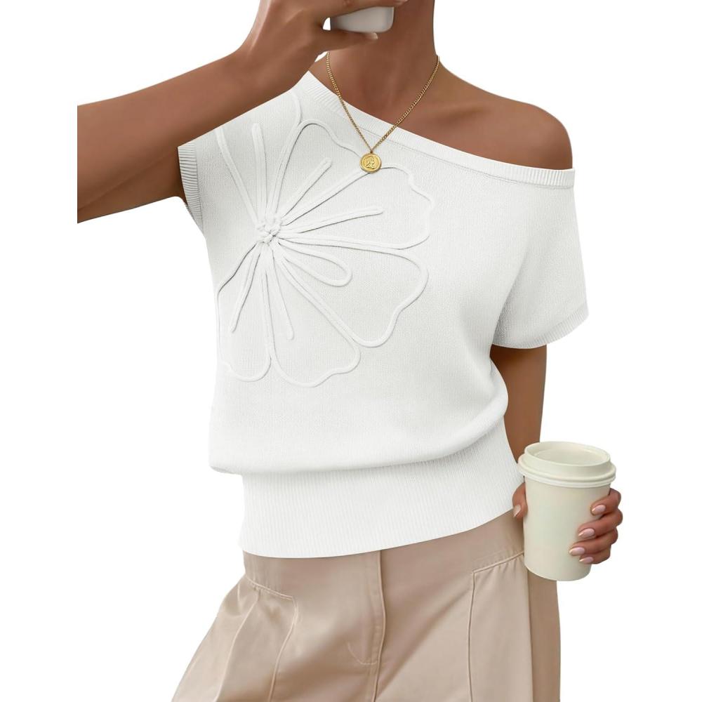 ZESICA Women’s Off Shoulder Floral Sweaters Tops 2026 Summer Sleeveless Loose Knit Cute Pullover Trendy Clothes(White)