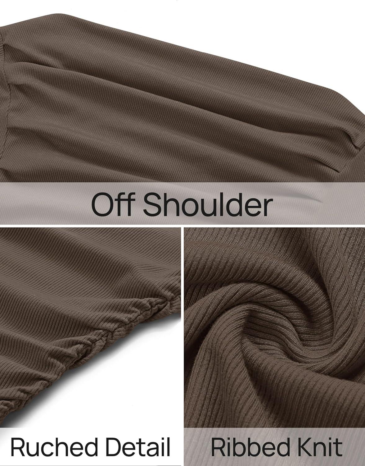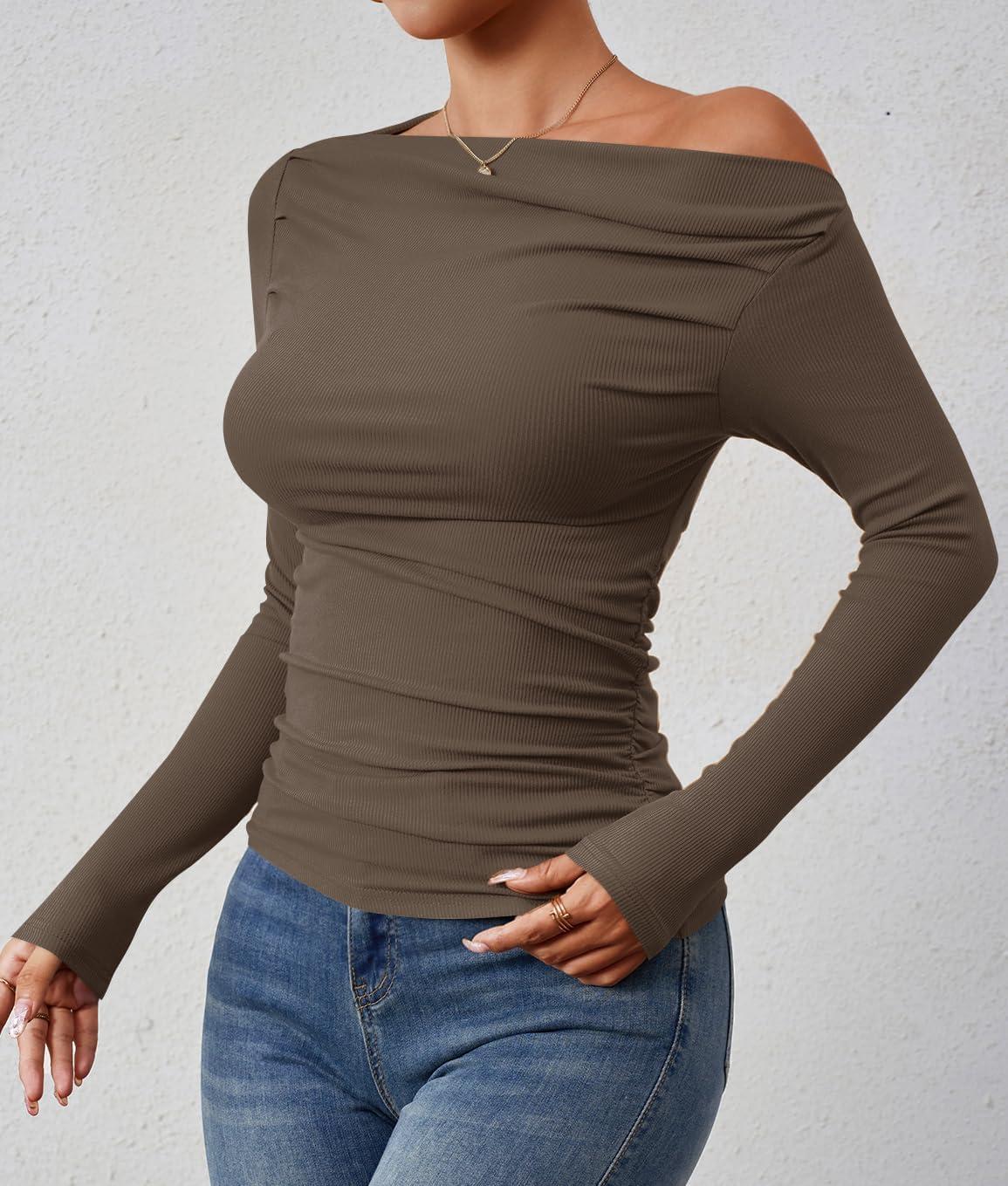 ZESICA Womens Off Shoulder Long Sleeve Tops 2025 Fall Casual Boat Neck Ruched Slim Fit Going Out Y2k Shirts Blouses(Coffee)