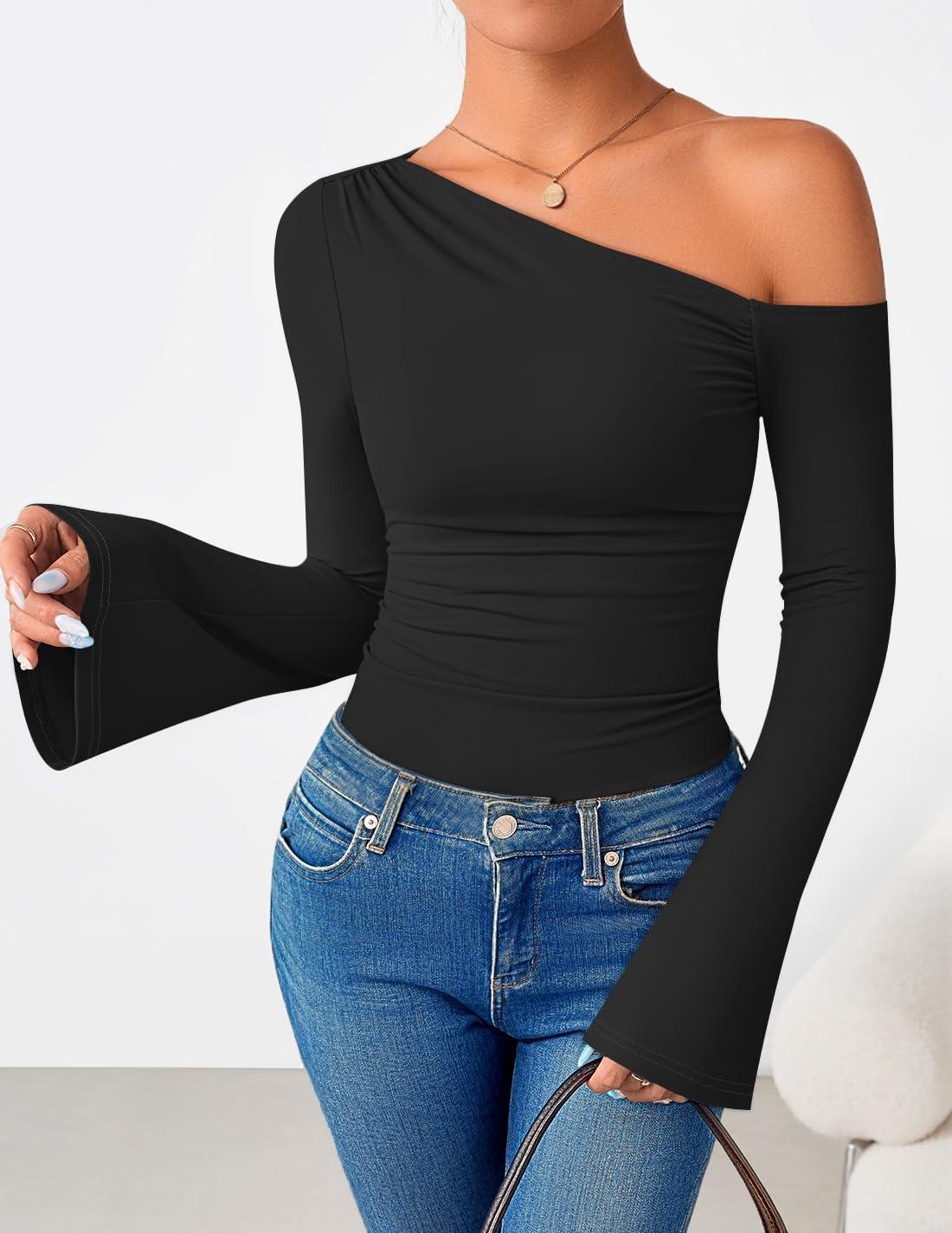 Don’t miss out on our limited-time offer: buy ZESICA Women’s Off Shoulder Tops Bell Long Sleeve Shirts 2025 Fall Trendy Going Out Ruched Tight Fitted Y2K Clothes(Black), get a free {accessory}!