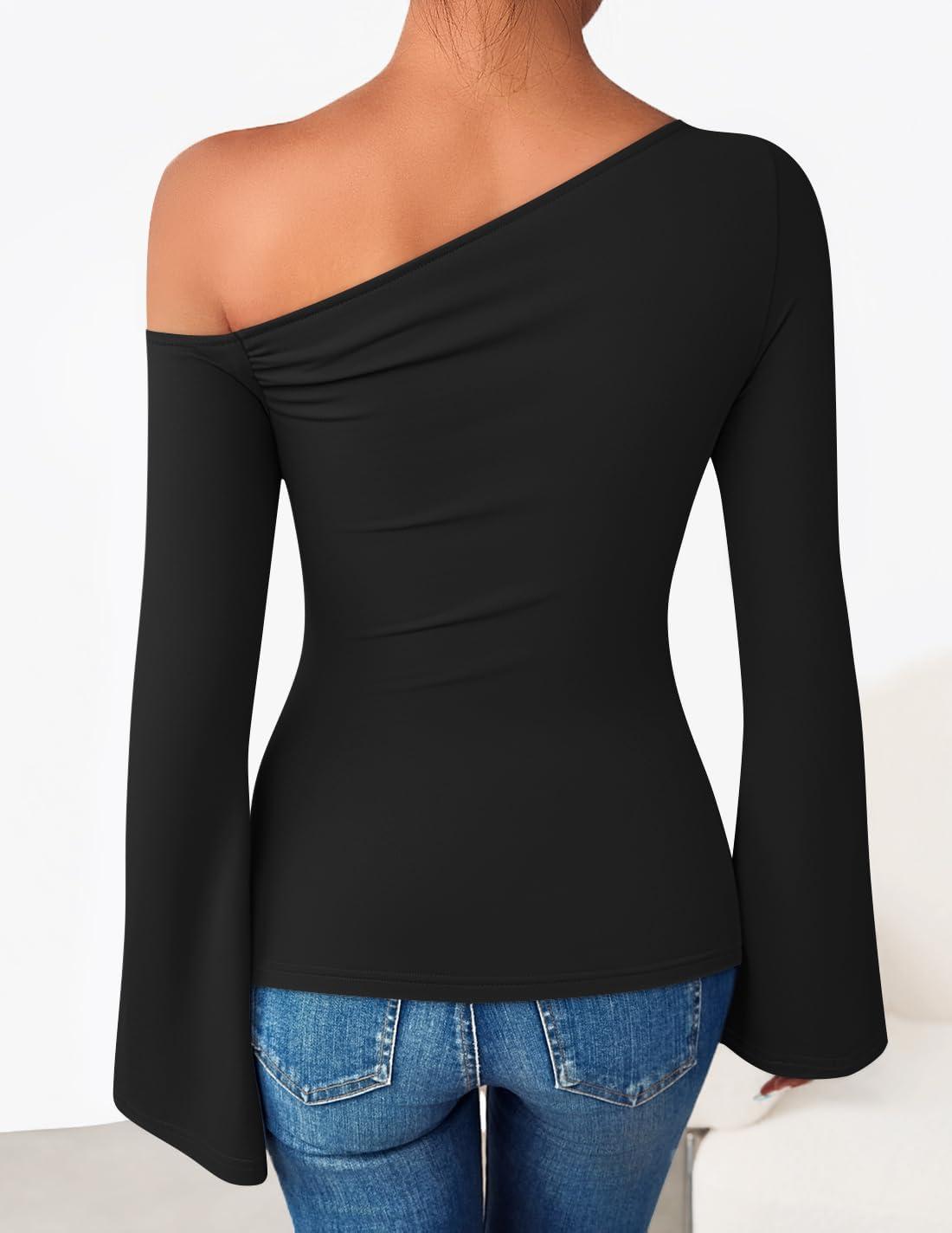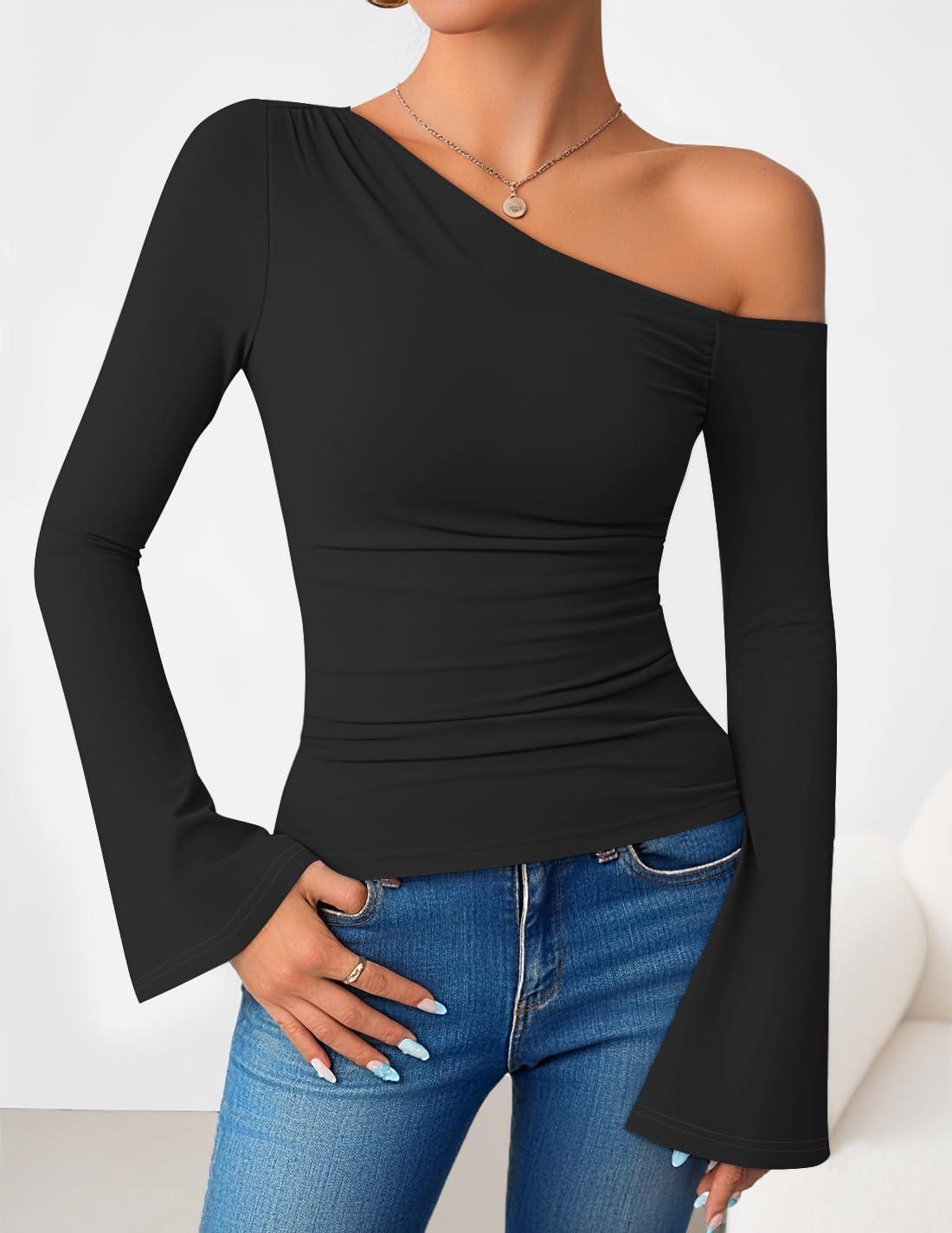 ZESICA Women’s Off Shoulder Tops Bell Long Sleeve Shirts 2025 Fall Trendy Going Out Ruched Tight Fitted Y2K Clothes(Black)