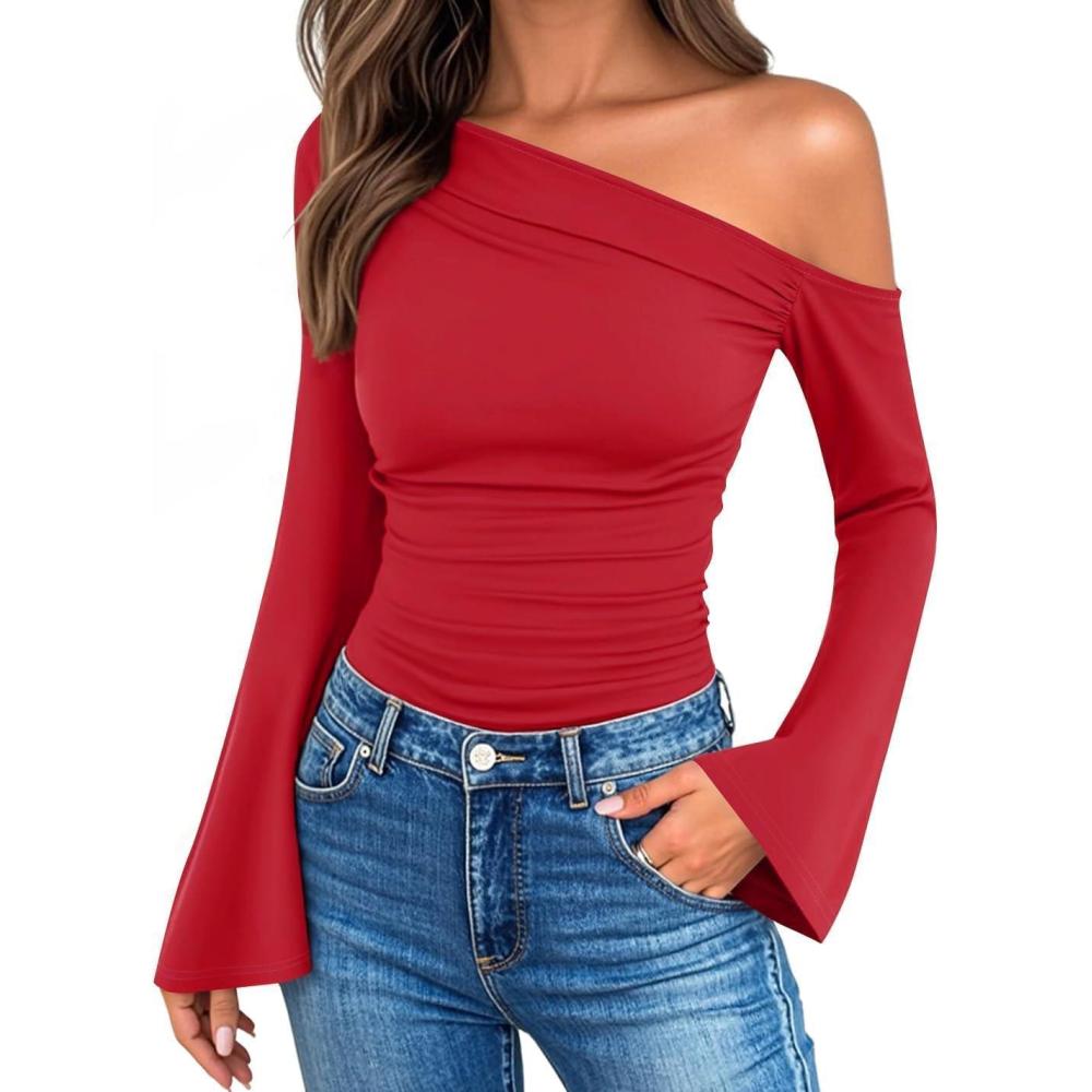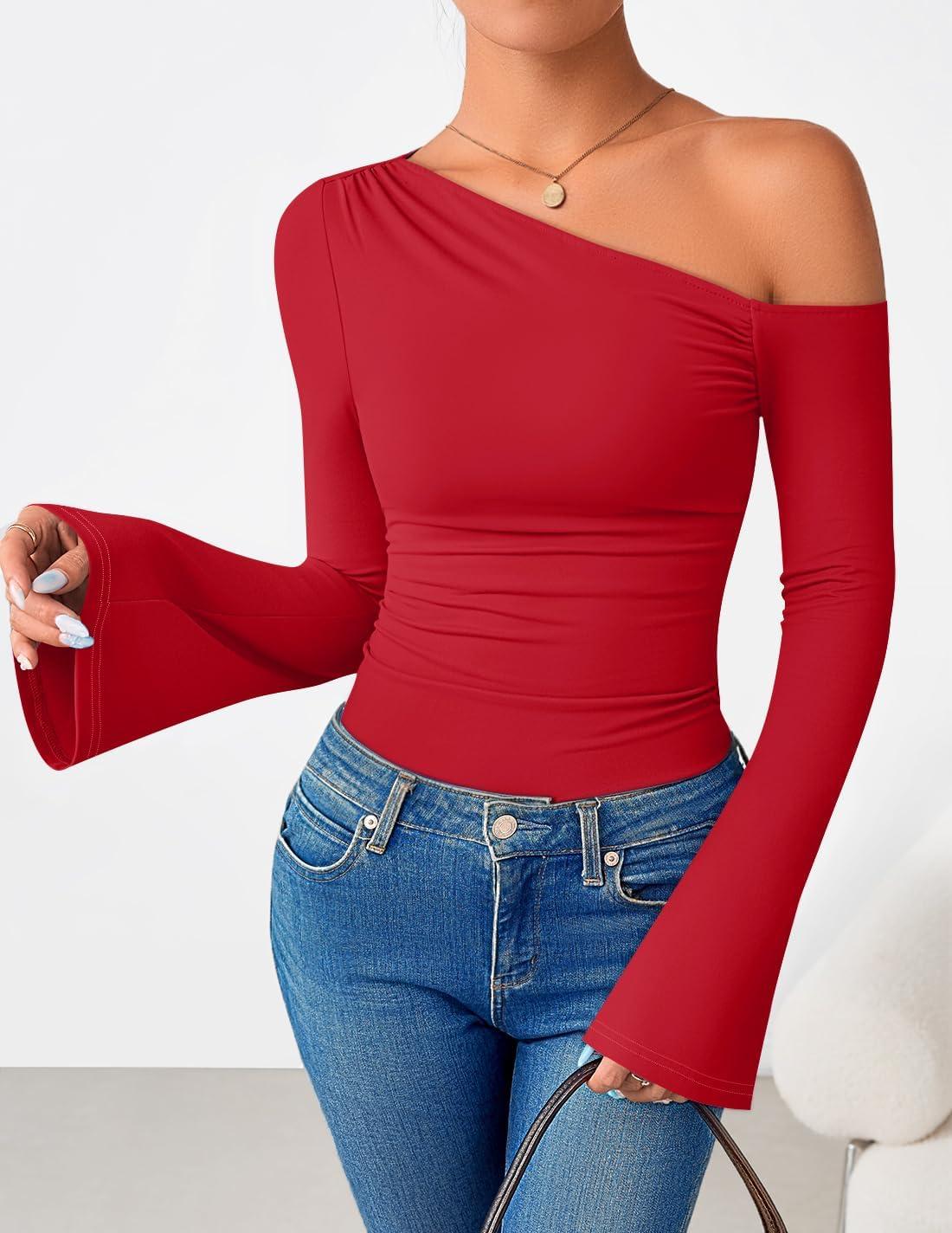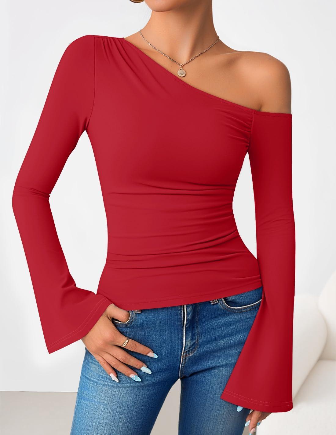 ZESICA Women’s Off Shoulder Tops Bell Long Sleeve Shirts 2025 Fall Trendy Going Out Ruched Tight Fitted Y2K Clothes(Red)