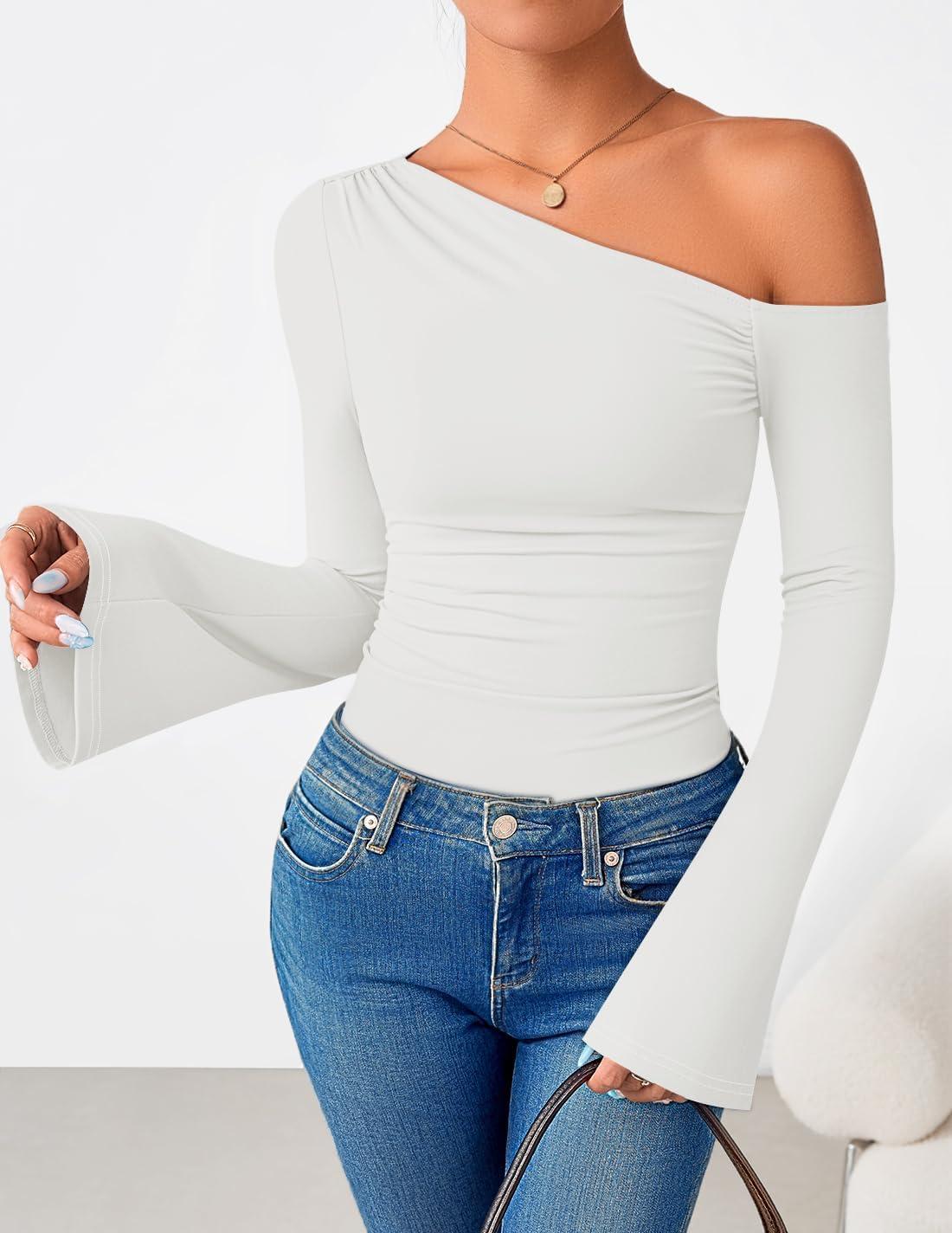 ZESICA Women's Off Shoulder Tops Bell Long Sleeve Shirts 2025 Fall Trendy Going Out Ruched Tight Fitted Y2K Clothes(White)