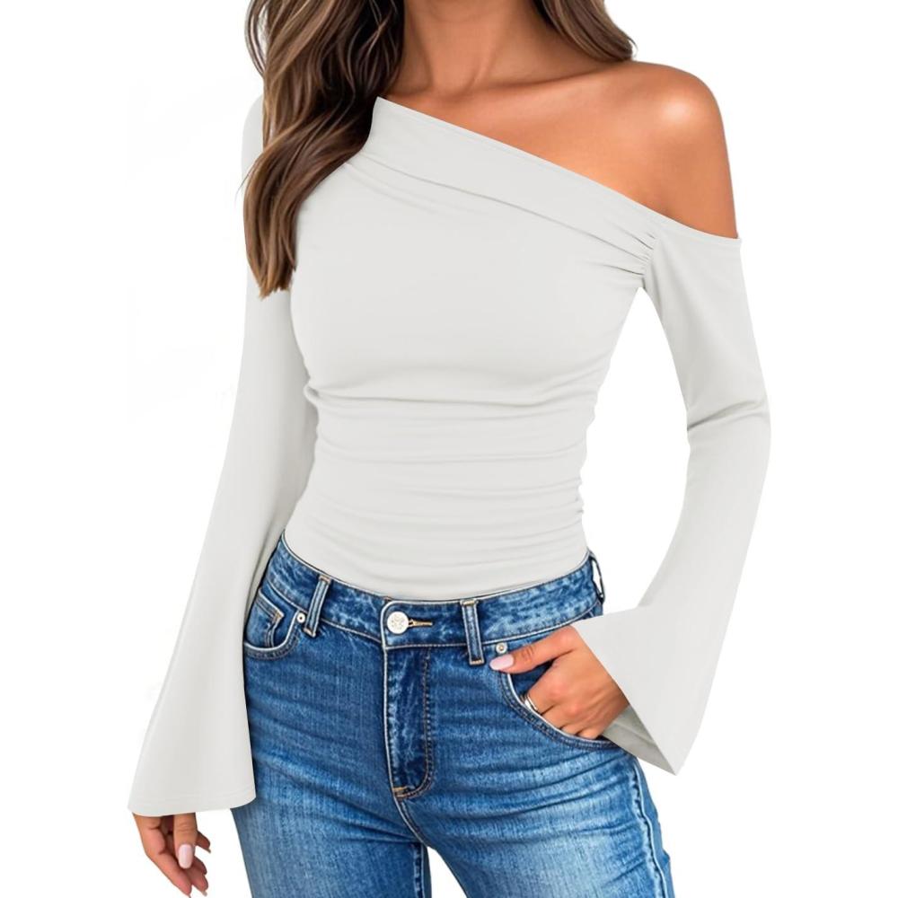 ZESICA Women’s Off Shoulder Tops Bell Long Sleeve Shirts 2025 Fall Trendy Going Out Ruched Tight Fitted Y2K Clothes(White)