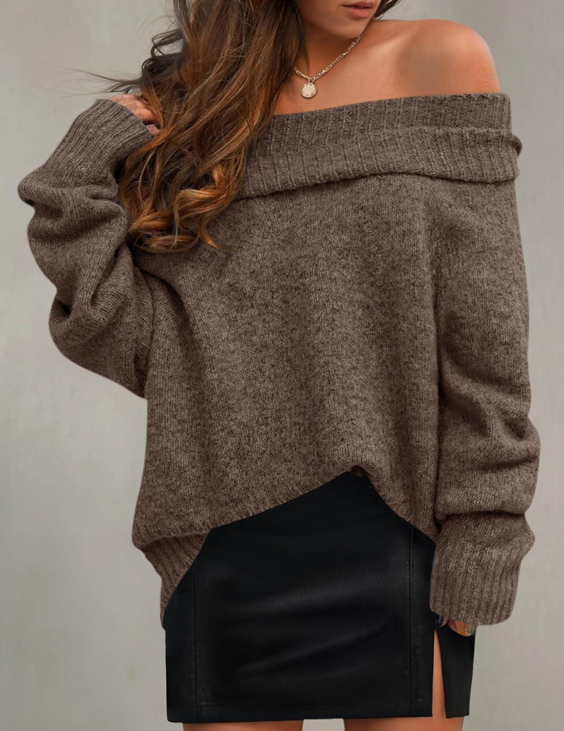ZESICA Women’s Off The Shoulder Fall Sweaters Oversized Long Sleeve Pullover Tops 2025 Fashion Outfit Clothes(Coffee)