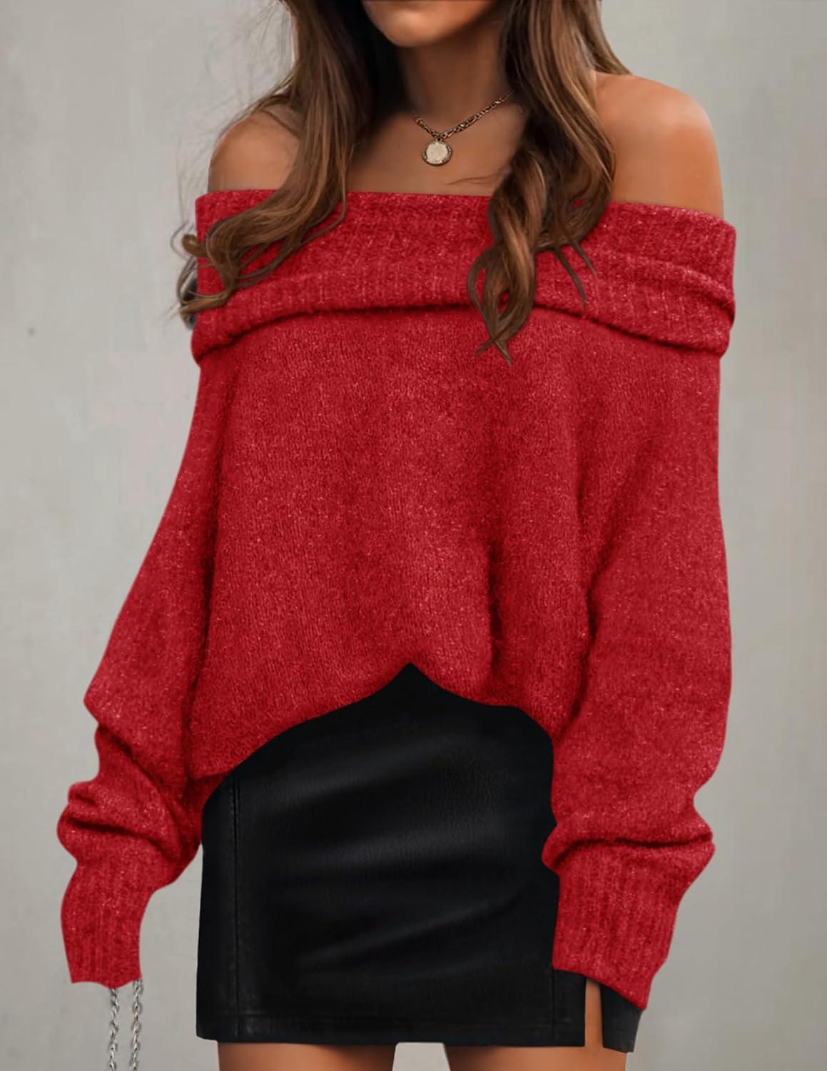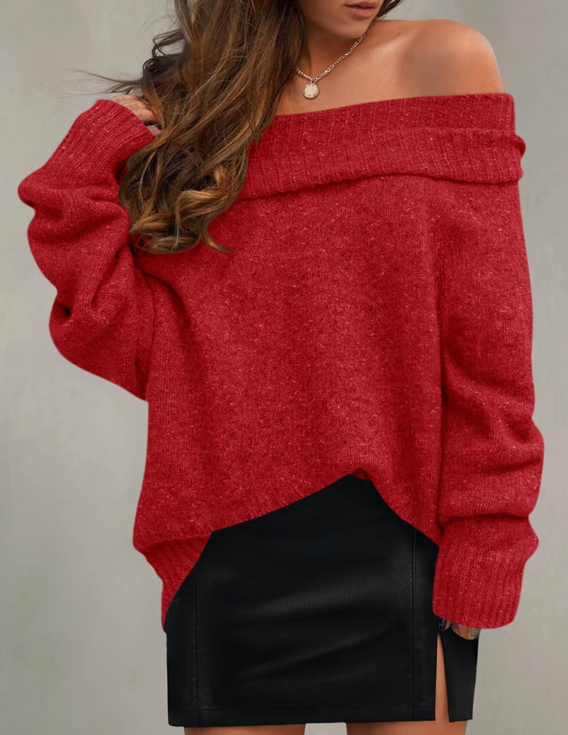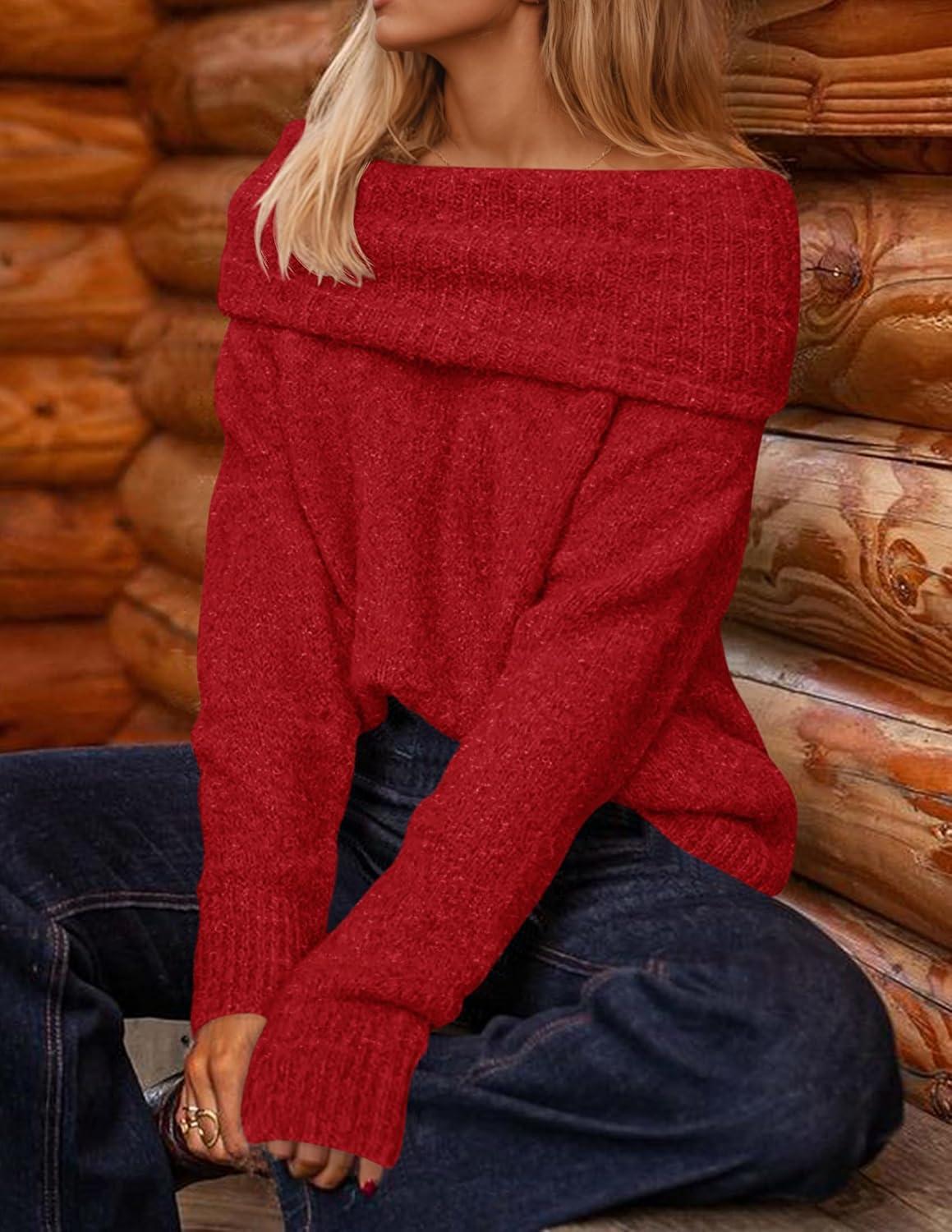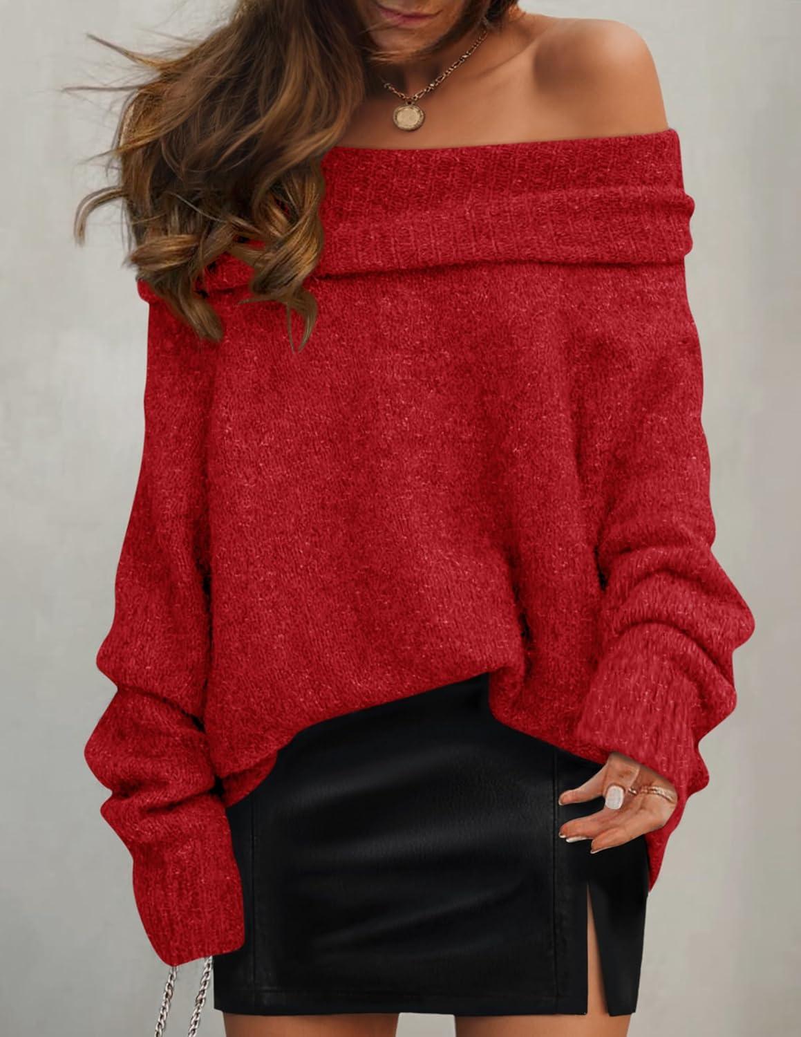 ZESICA Women’s Off The Shoulder Fall Sweaters Oversized Long Sleeve Pullover Tops 2025 Fashion Outfit Clothes(Red)