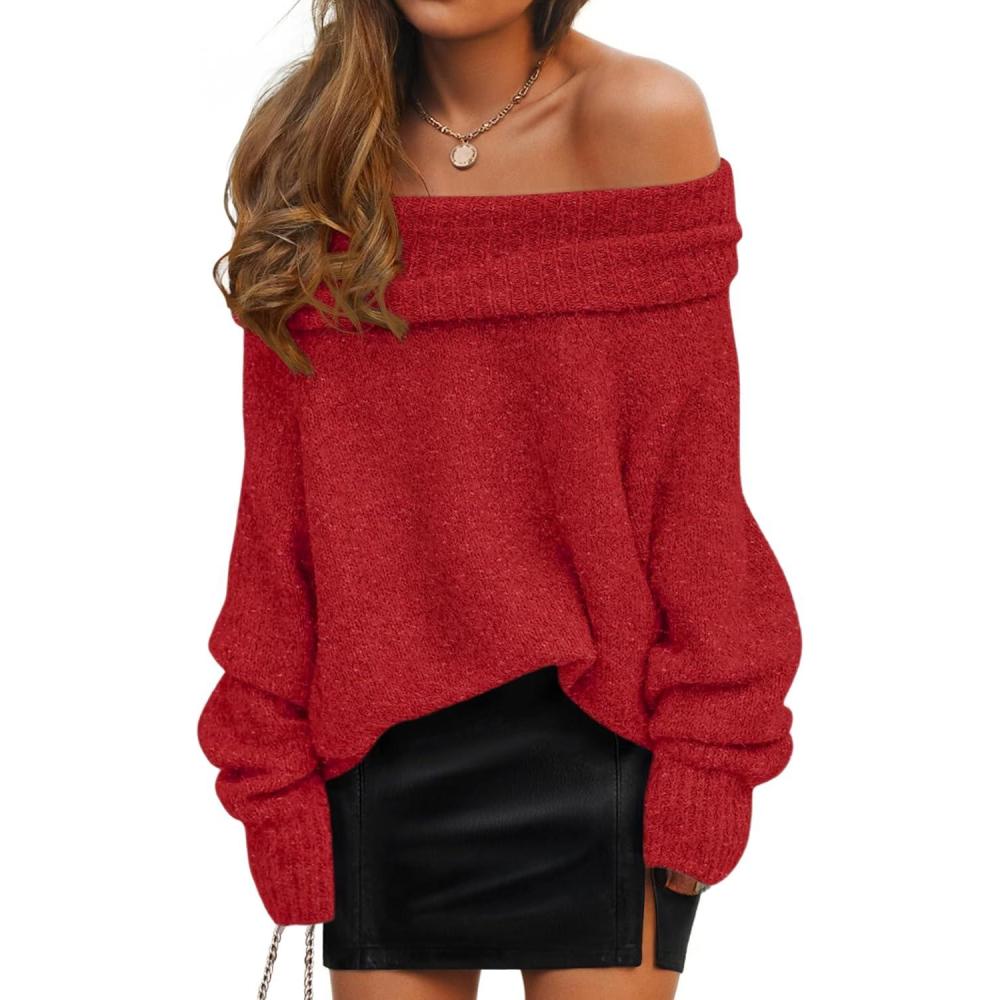 imageZESICA Womens Off The Shoulder Fall Sweaters Oversized Long Sleeve Pullover Tops 2025 Fashion Outfit ClothesRed