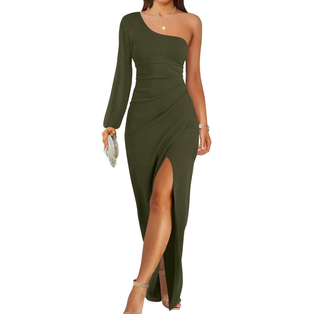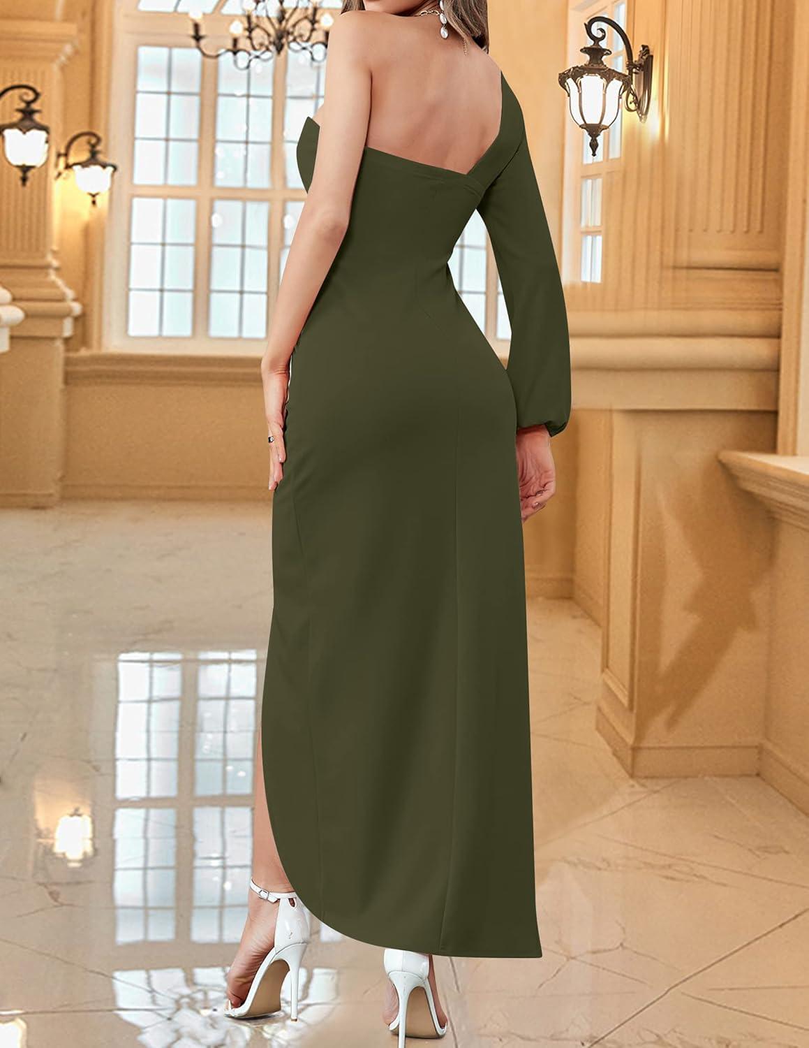 ZESICA Women's One Shoulder Long Sleeve Cocktail Dress Sexy High Slit Ruched Bodycon Wedding Guest Maxi Dresses(Armygreen)