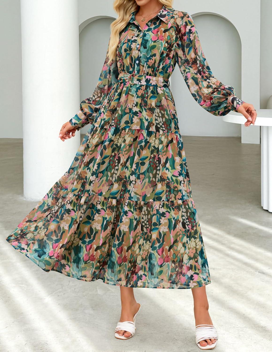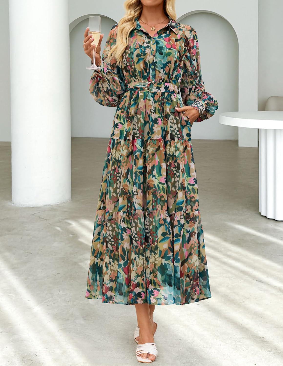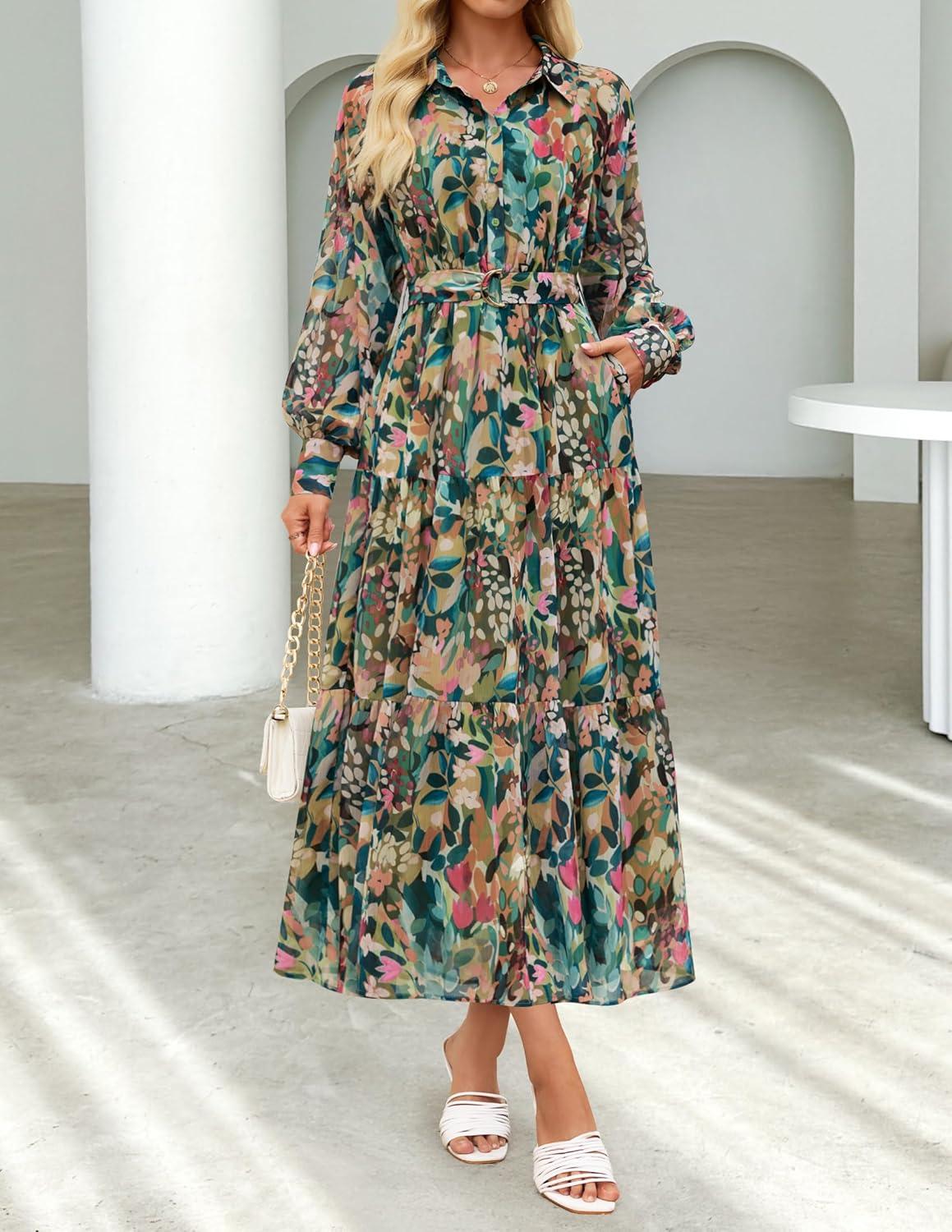 ZESICA Women’s Spring Floral Long Sleeve Maxi Dresses 2026 Casual Button Belted Chiffon Boho Wedding Guest Party Dress(Darkgreen)