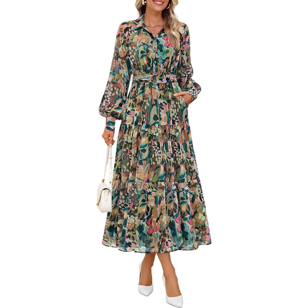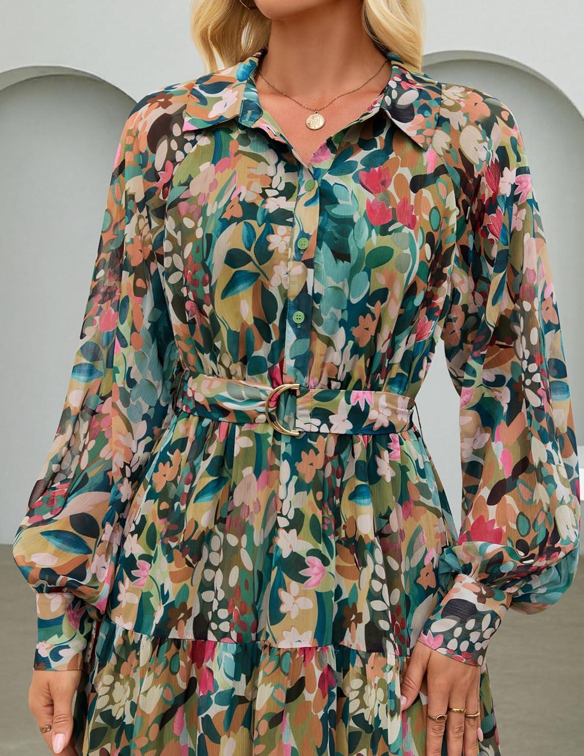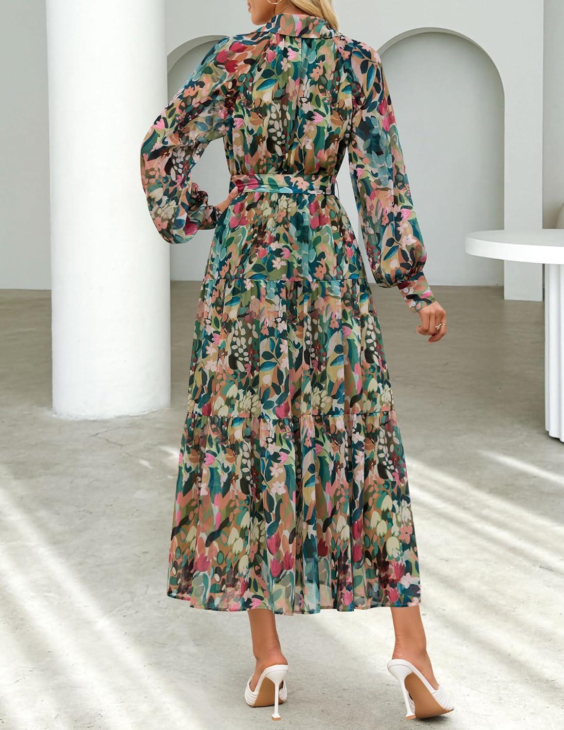 ZESICA Women’s Spring Floral Long Sleeve Maxi Dresses 2026 Casual Button Belted Chiffon Boho Wedding Guest Party Dress(Darkgreen)