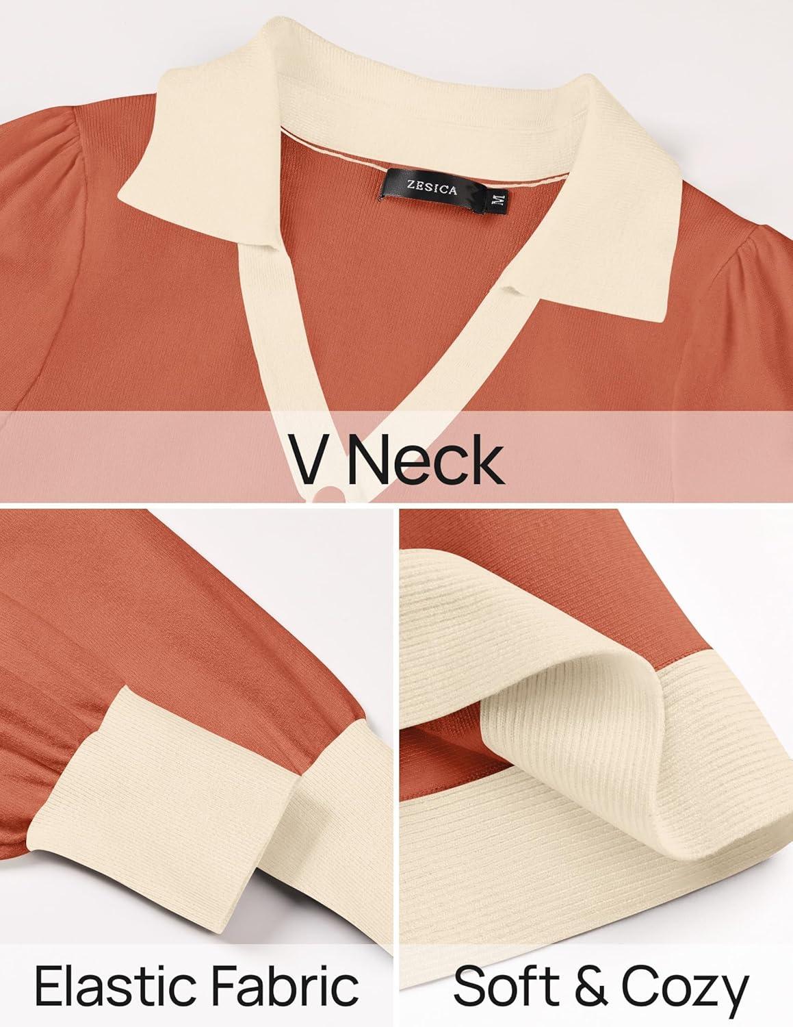 imageZESICA Womens Spring Long Sleeve V Neck Sweater Dress Collar Ribbed Knit Mini DressesPurple