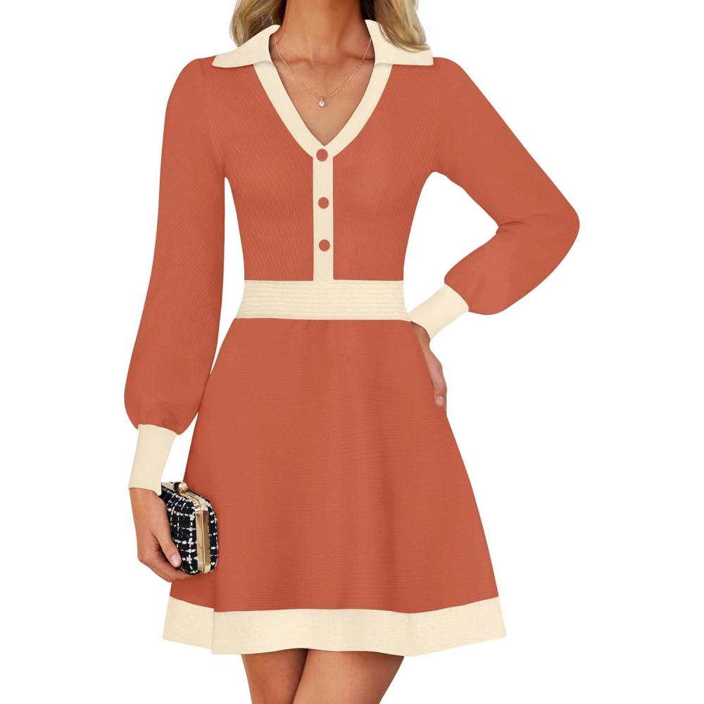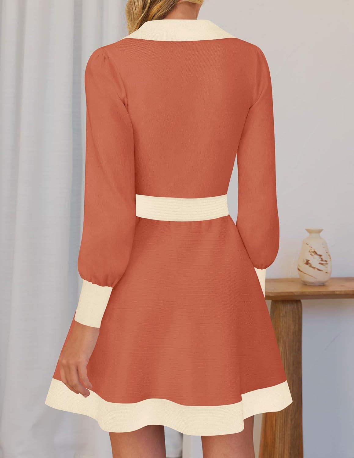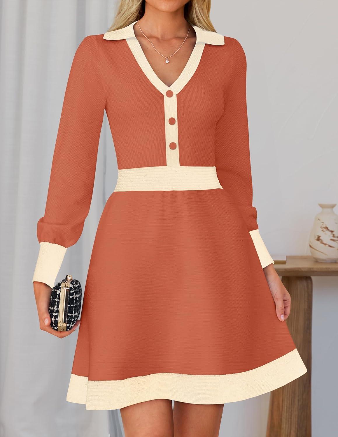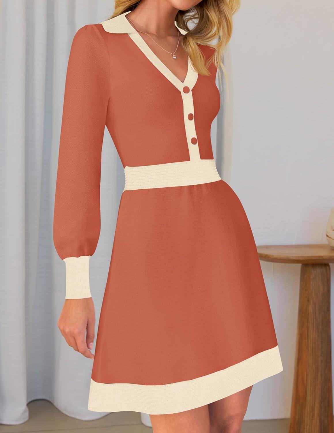 ZESICA Women’s Spring Long Sleeve V Neck Sweater Dress Collar Ribbed Knit Mini Dresses(Coral)