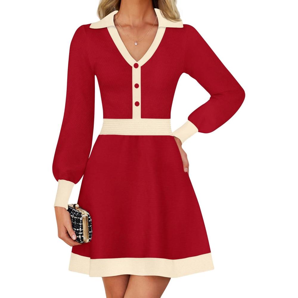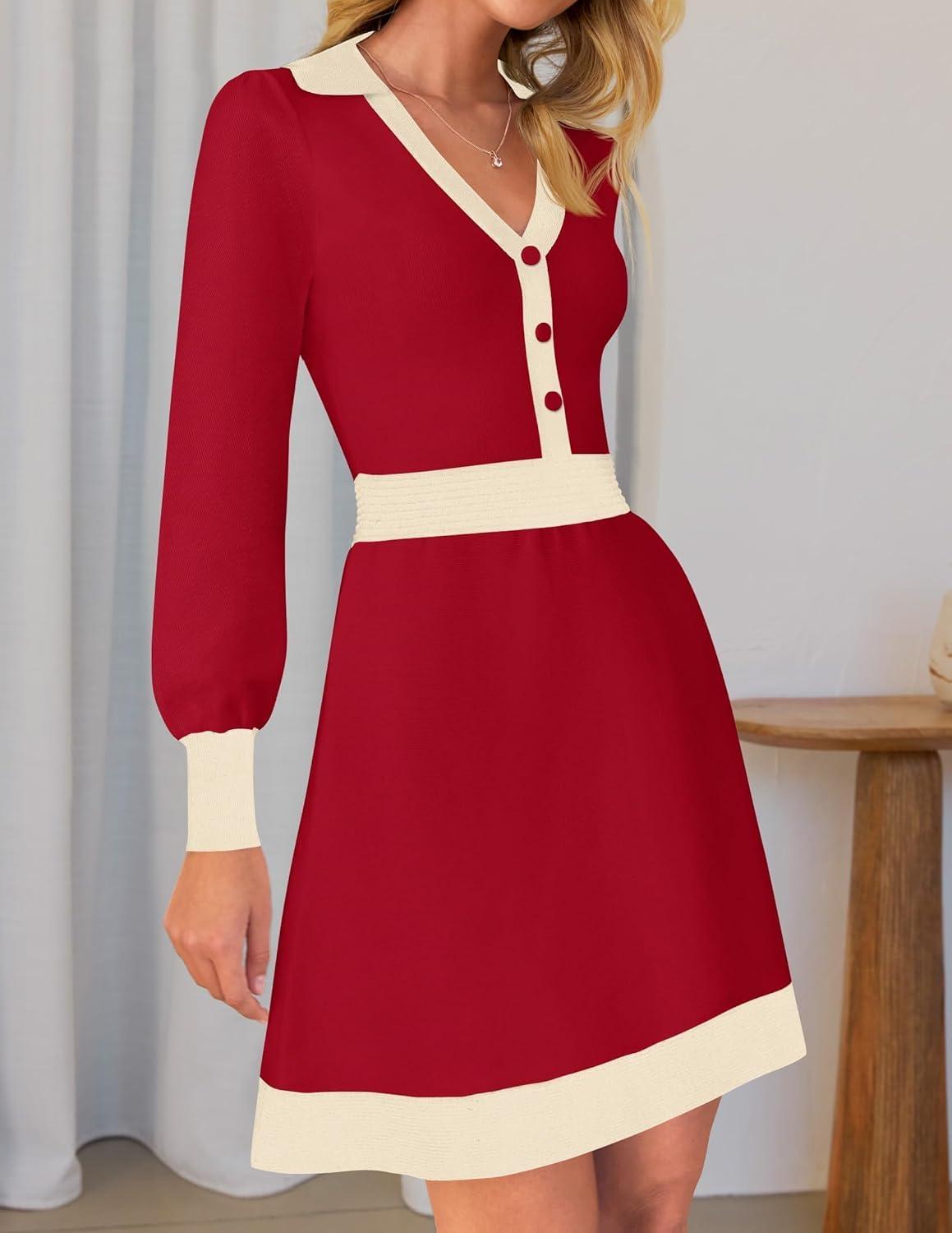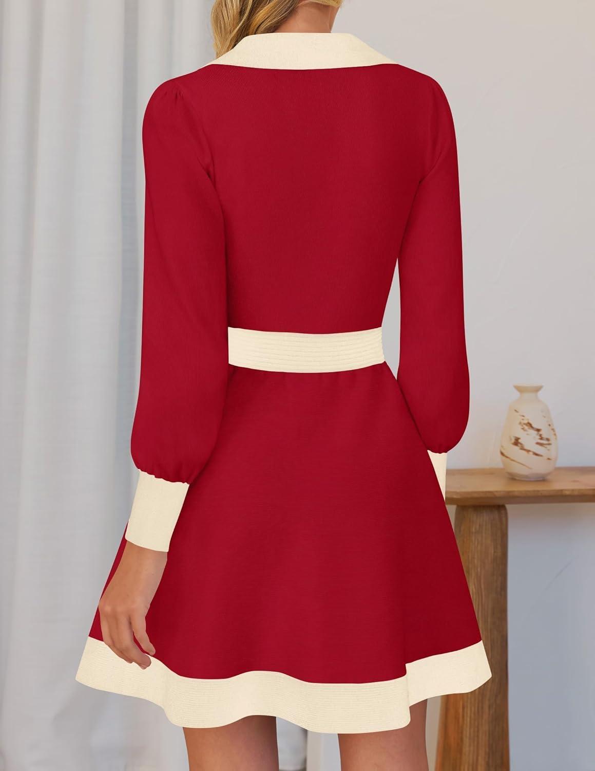 ZESICA Women’s Spring Long Sleeve V Neck Sweater Dress Collar Ribbed Knit Mini Dresses(Red)