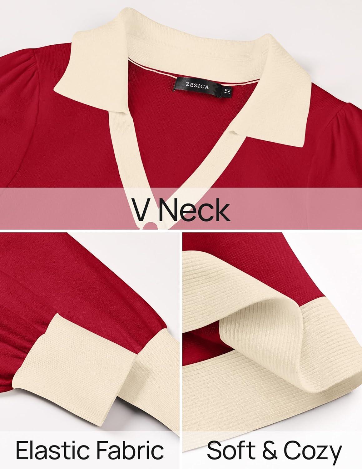 imageZESICA Womens Spring Long Sleeve V Neck Sweater Dress Collar Ribbed Knit Mini DressesRed