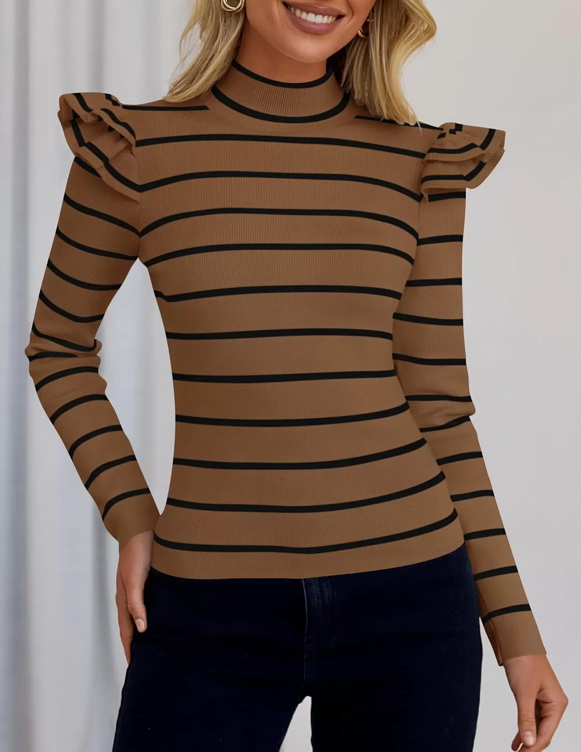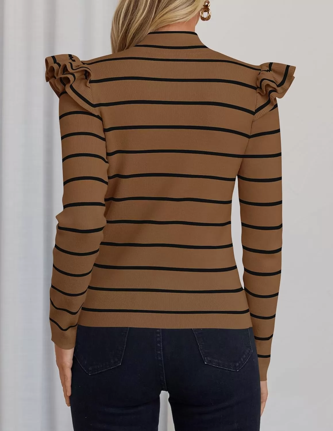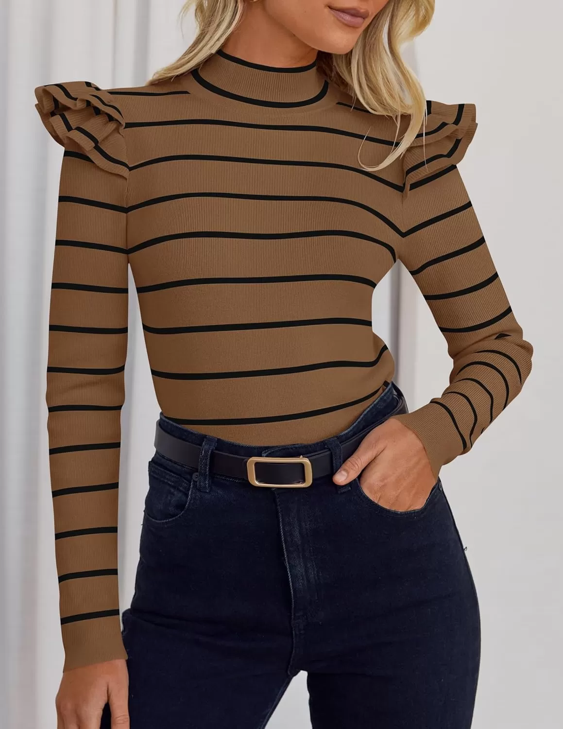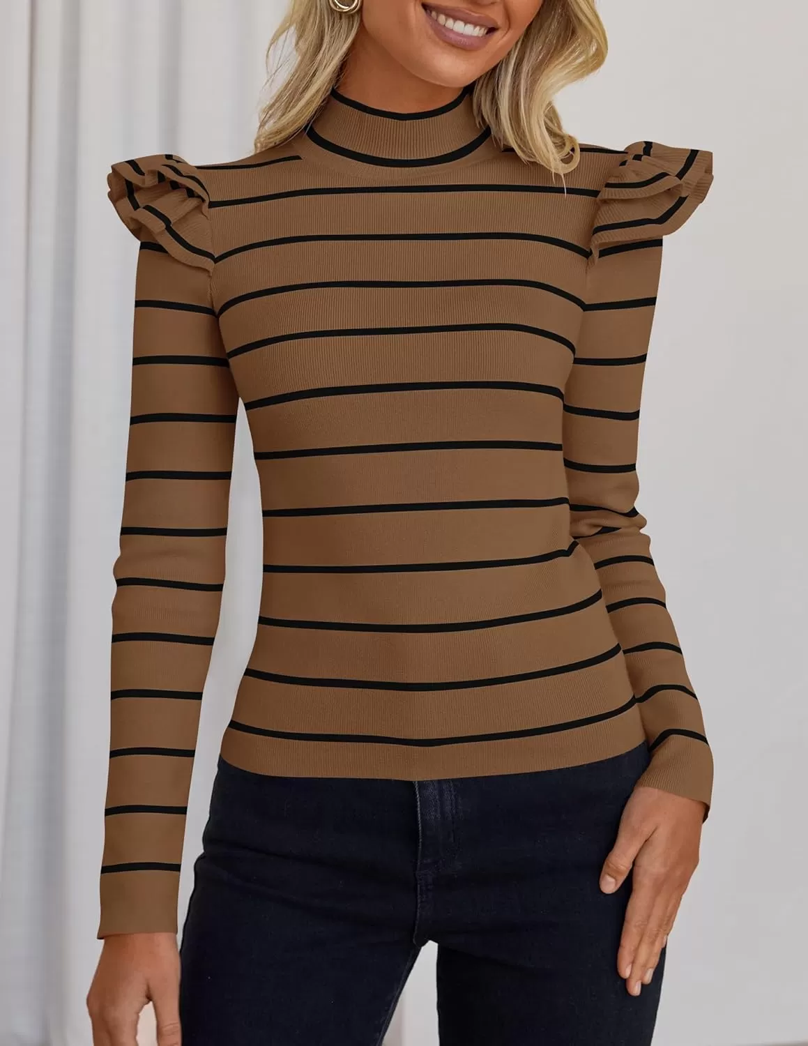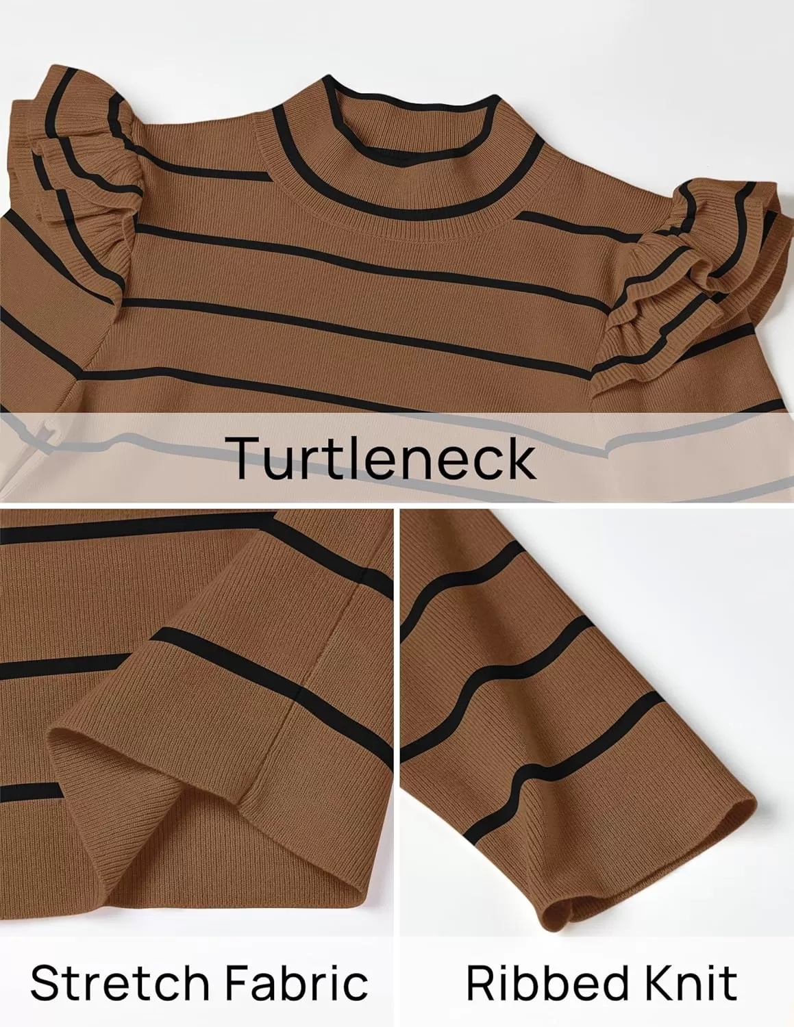ZESICA Womens Striped Ruffle Long Sleeve Sweaters 2024 Fall Turtleneck Ribbed Knit Slim Fit Basic Casual Pullover Tops(Brown)