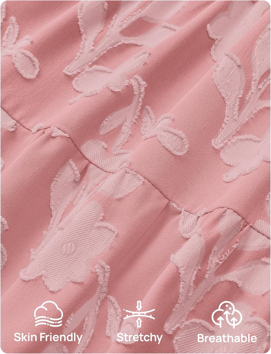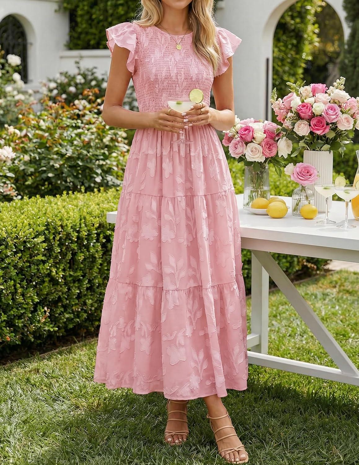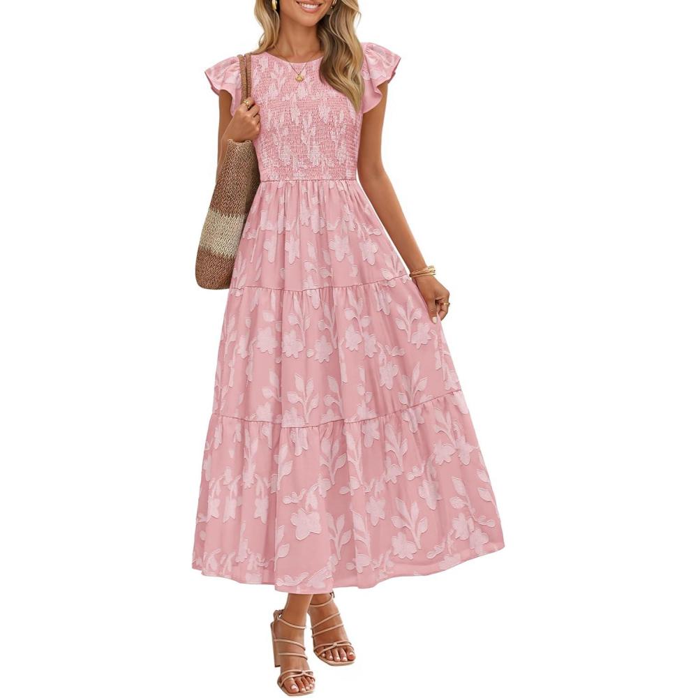 ZESICA Women’s Summer Boho Floral Midi Dress 2026 Casual Flutter Short Sleeve Crewneck Smocked Flowy Beach Long Dresses(Pink)