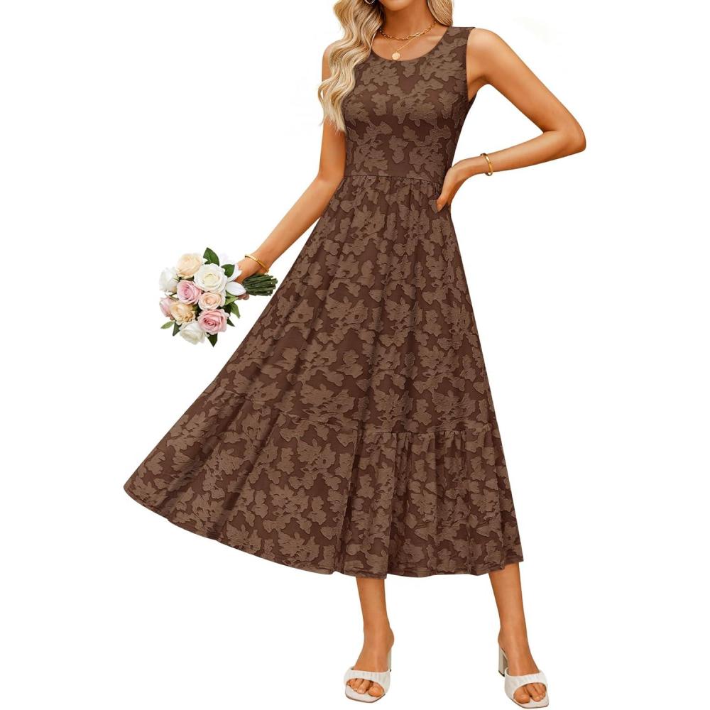 ZESICA Women‘s Summer Boho Floral Midi Dress 2026 Sleeveless Beach Vacation Dresses Casual Flowy Sundress(Brown)