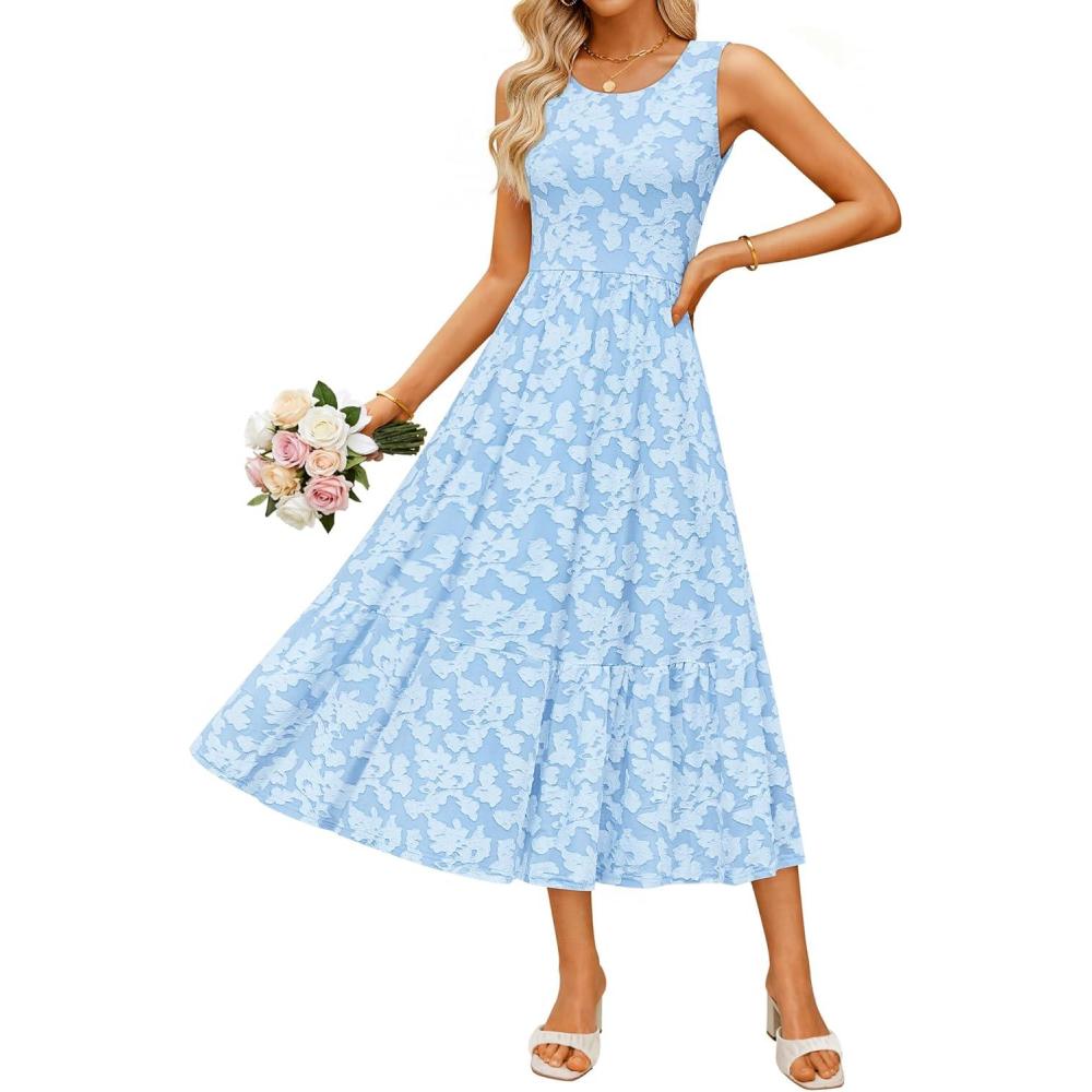 ZESICA Women‘s Summer Boho Floral Midi Dress 2026 Sleeveless Beach Vacation Dresses Casual Flowy Sundress(Light Blue)