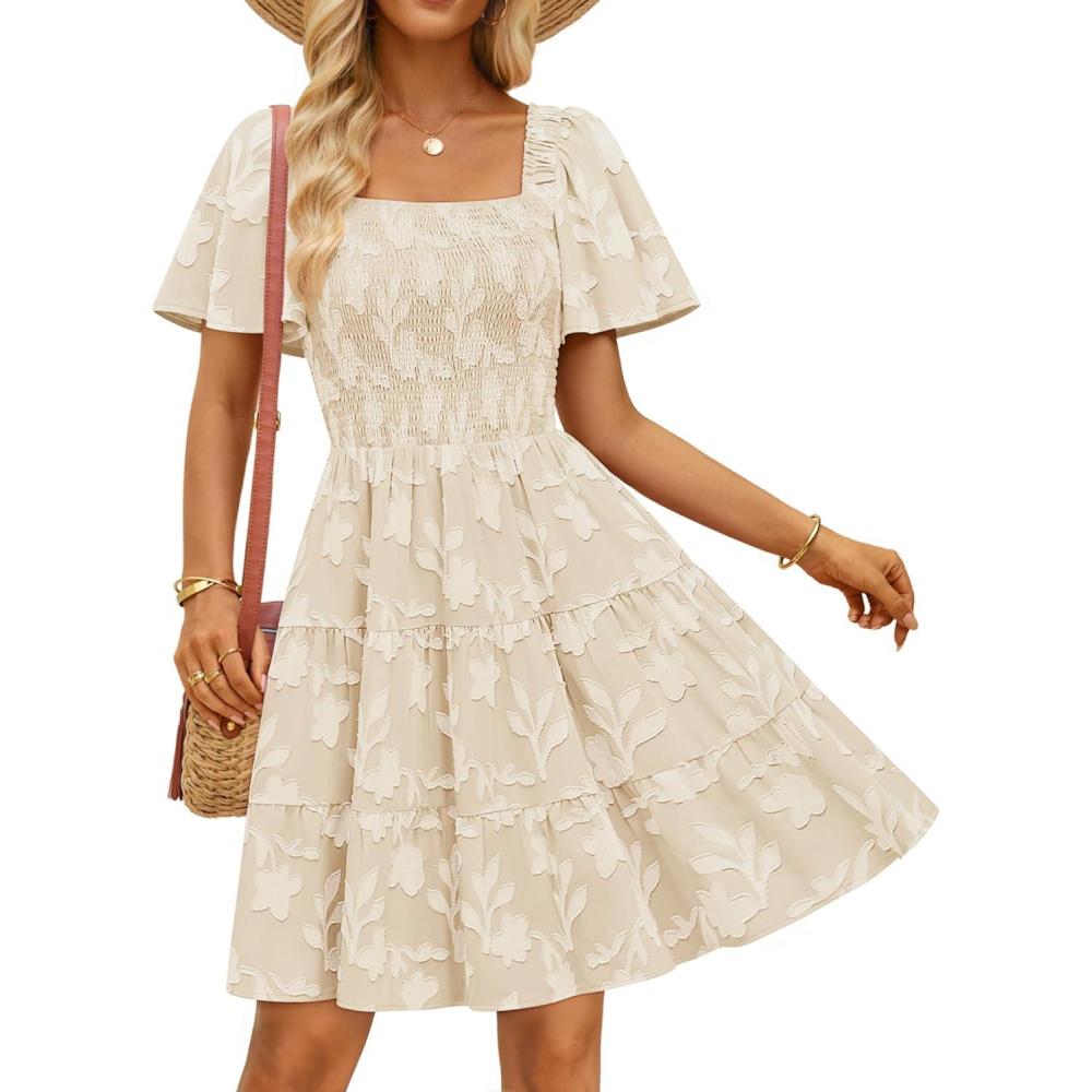 ZESICA Women’s Summer Boho Floral Mini Dress 2026 Casual Short Sleeve Square Neck Swing Beach Vacation Sundress(Apricot)