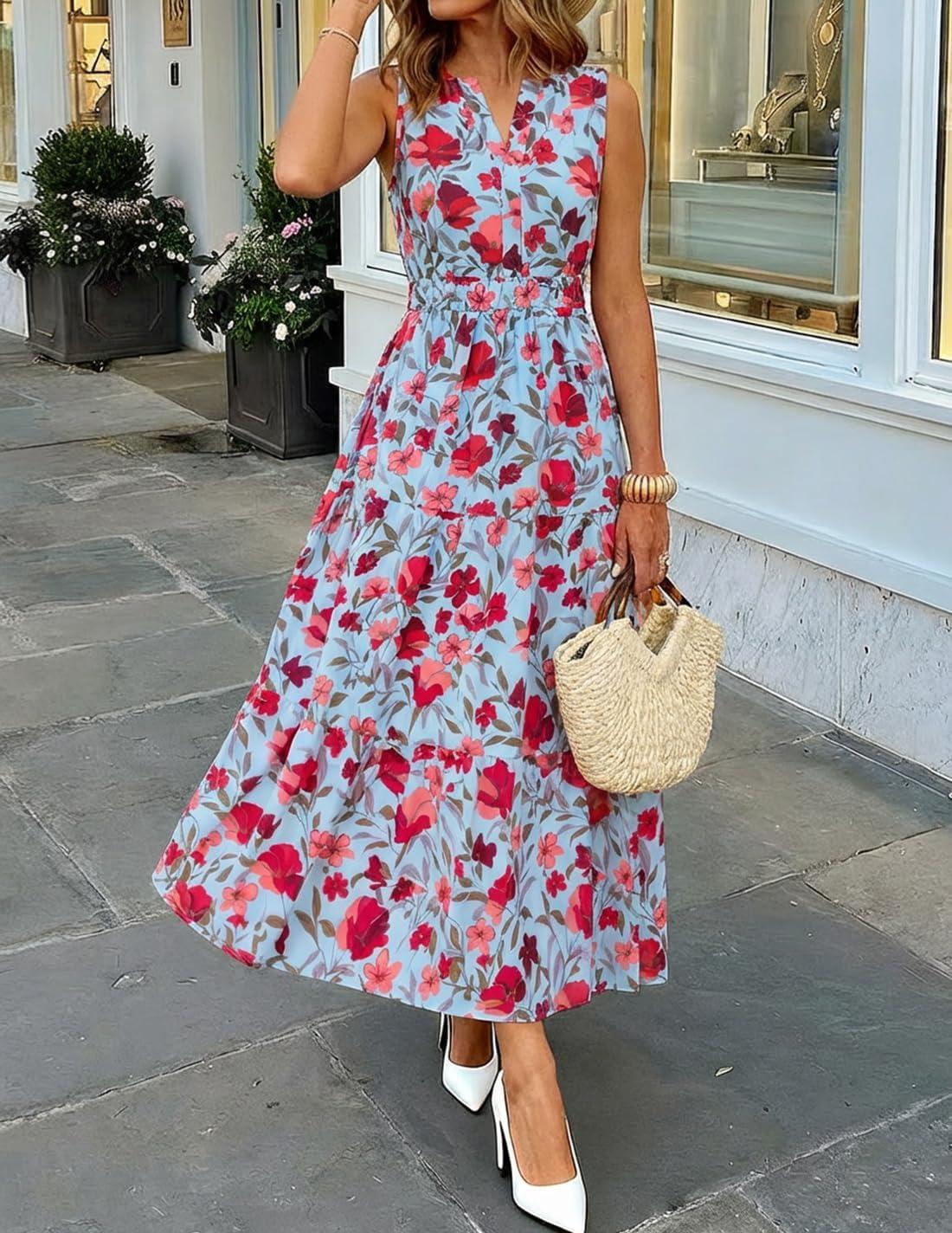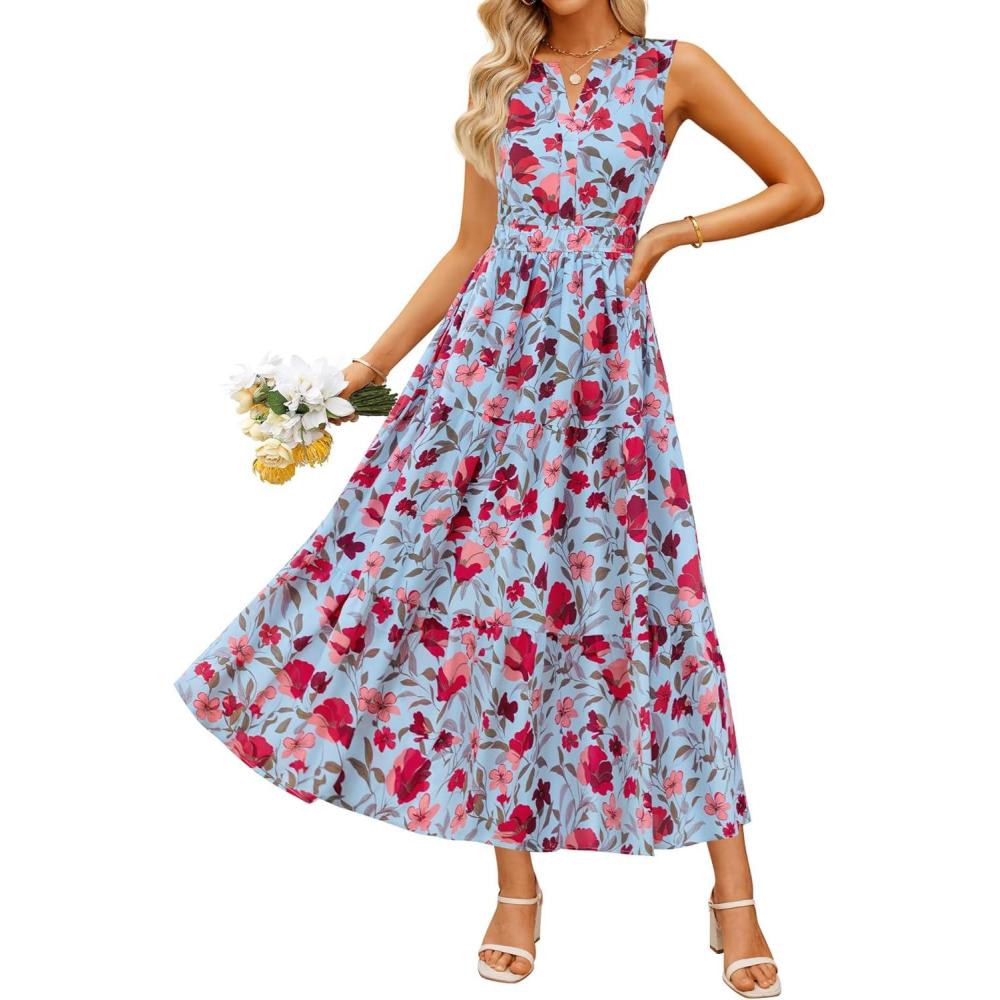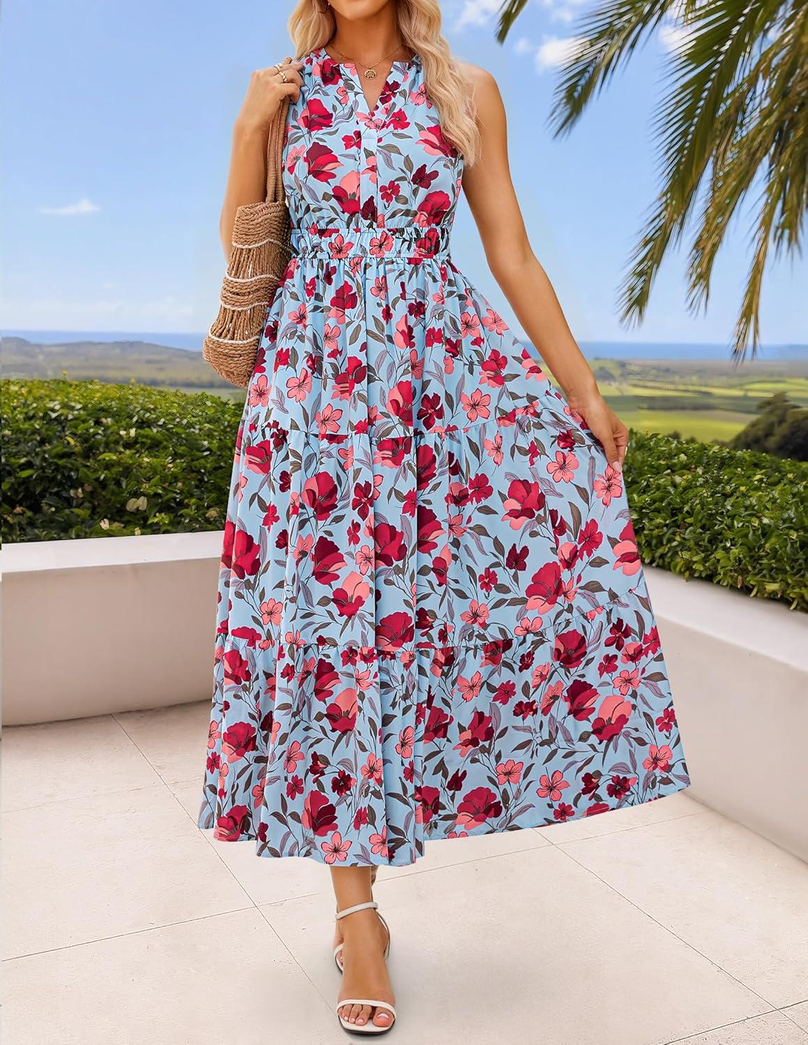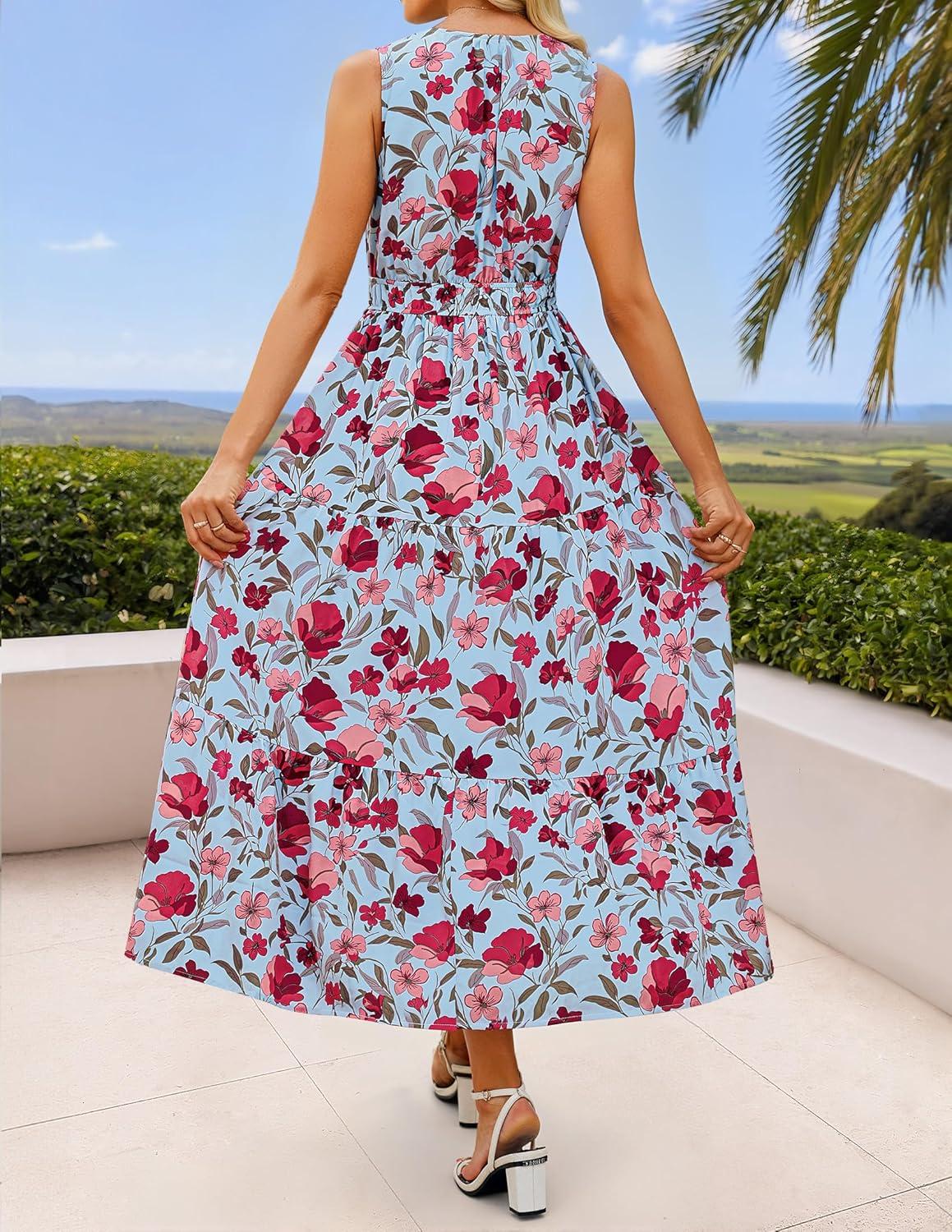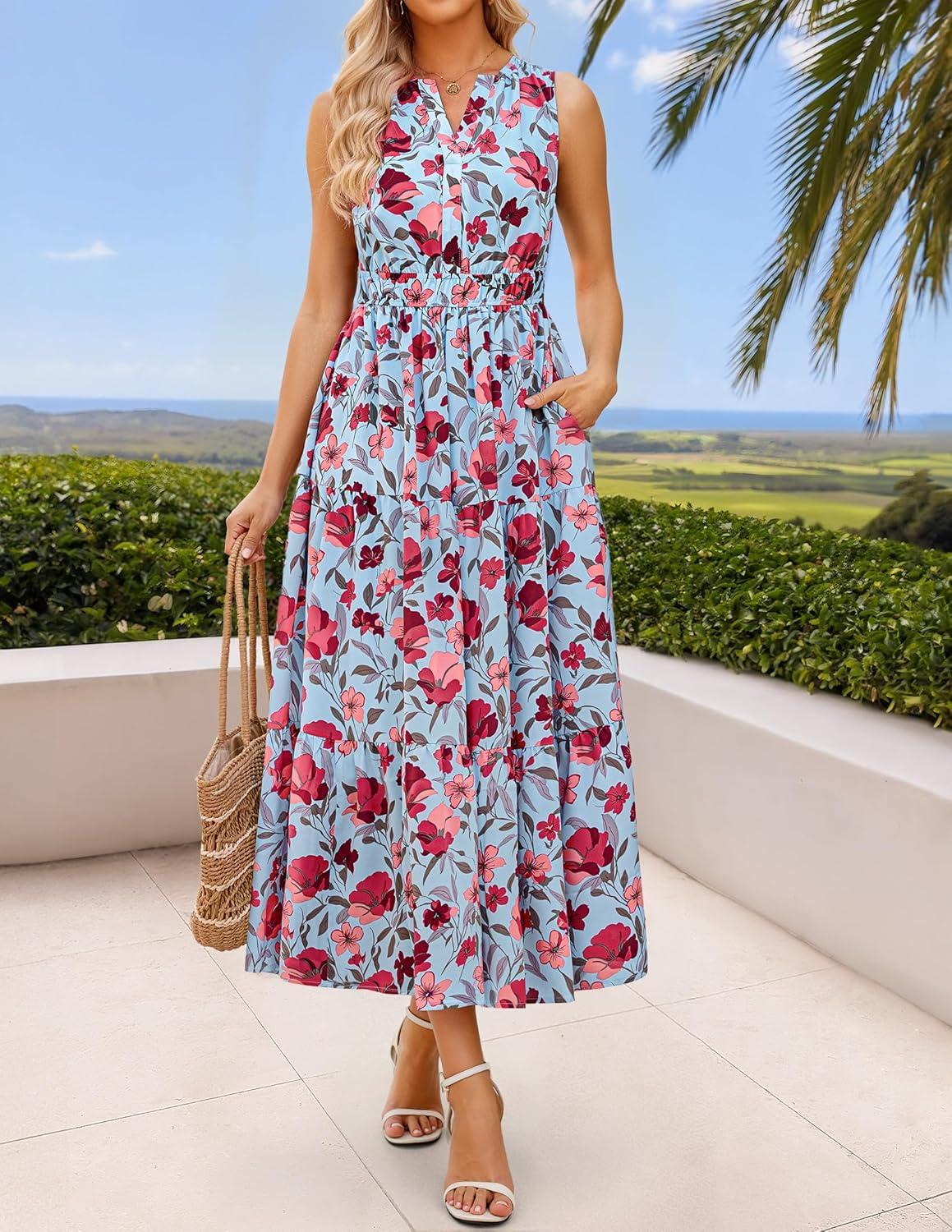 ZESICA Women’s Summer Boho Floral Sleeveless Midi Dress 2026 V Neck A Line Flowy Casual Beach Long Dresses with Pockets(Sky Blue)