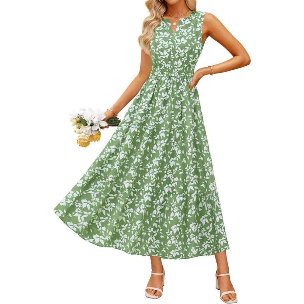 ZESICA Women’s Summer Boho Floral Sleeveless Midi Dress 2026 V Neck Elastic High Waist Flowy Casual Beach Long Dresses(Green)
