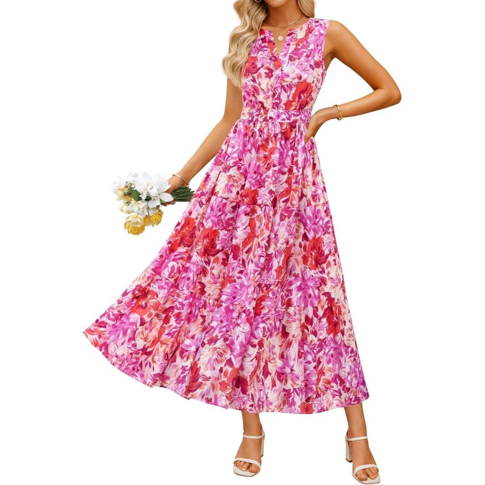 ZESICA Women’s Summer Boho Floral Sleeveless Midi Dress 2026 V Neck Elastic High Waist Flowy Casual Beach Long Dresses(Pink)