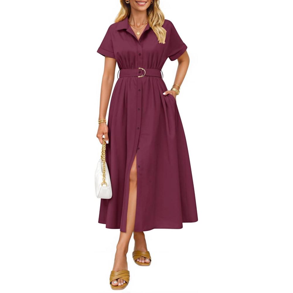 ZESICA Women’s Summer Button Down Midi Dress 2026 Short Sleeve A Line Belt Buiness Casual Shirt Dresses with Pockets(Fuchsia)