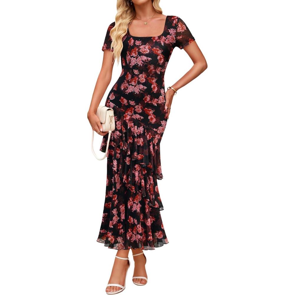 ZESICA Women’s Summer Floral Bodycon Maxi Dress 2026 Square Neck Mesh Ruffle Elegant Cocktail Wedding Party Long Dresses(Black)